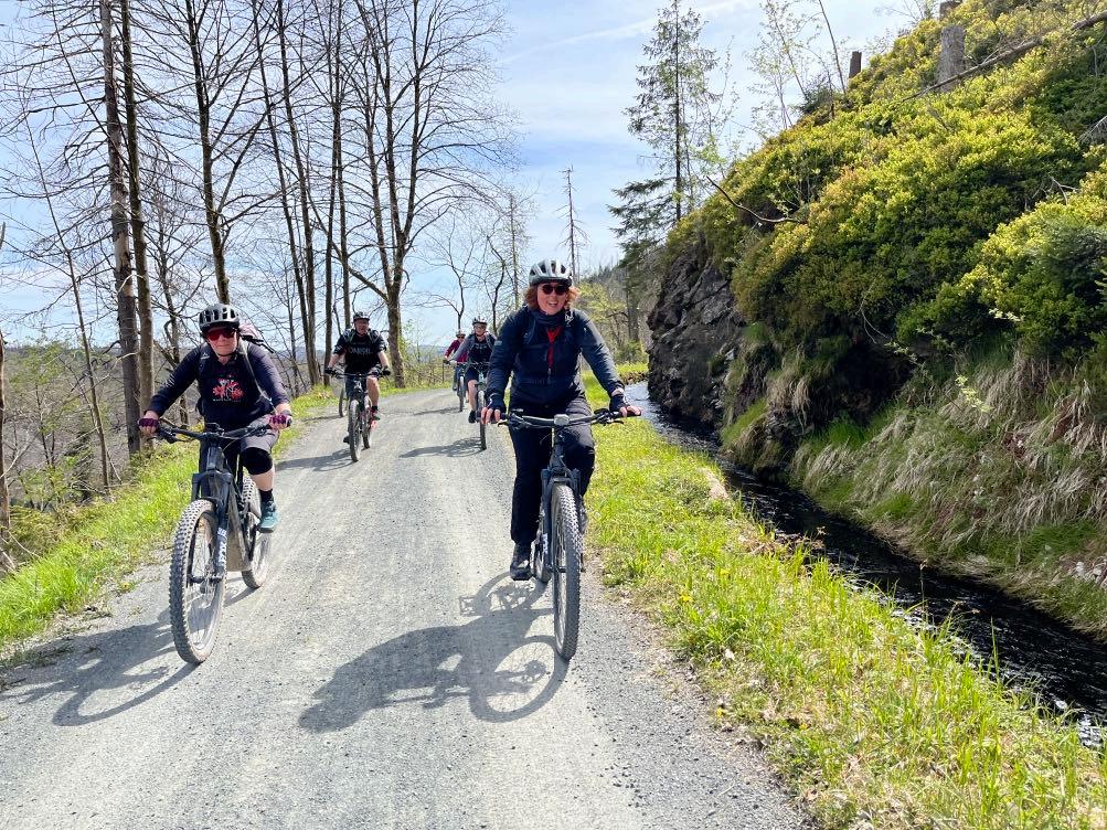 Auf geht´s zum Bikepark St. Andreasberg. Zunächst rollen wir ganz kurz im Ort ein. Danach erklimmen wir das Sportplatzgelände von Braunlage. Verschiedene Wege führen zum Silberteich. Vom Silberteich starten wir in einen längeren Anstieg hinauf zu den Hahnenklee Klippen. Weiter nun abwärts zum Oderteich. Am Oderteich angekommen müssen wir für ca. 1,5 km auf die Verkehrsstrasse. Glücklicherweise ist diese nicht groß befahren. Belohnt werden wir dafür mit einem herrlichen Waalweg am Sonnenberg. Dieser führt uns bis fast an die Jordanshöhe. Nun folgt ein schmaler aber schöner Wiesentrail und mit einer letzten Schotterabfahrt erreichen wir den Bikepark St. Andreasberg. Hier gibt es verschiedene Lines. Bei Linie 1 handelt es sich um einen blauen Flowtrail. Linie 2 ist im unteren Bereich bereits deutlich anspruchsvoller. Im oberen flachen Bereich lediglich durch Wurzeln von Linie 1 unterscheidbar. Am Ende des Trails wartet die Sportklause für unsere Mittagseinkehr. Nach der Pause führt uns die Asphaltstraße in die Filmkulisse des „Harten Brocken“. Über Jordanshöhe und Rehgrabenweg kurbeln wir zum Oderteich. Hier ist ein Gruppenfoto Pflicht. Die letzten Höhenmeter des Tages bringen uns die Bikes nach Königskrug. Der abschließende Trail, vorbei am Bodewasserfall, endet direkt hinter dem Hotel. Ein aufregender und ereignisreicher Tag endet.