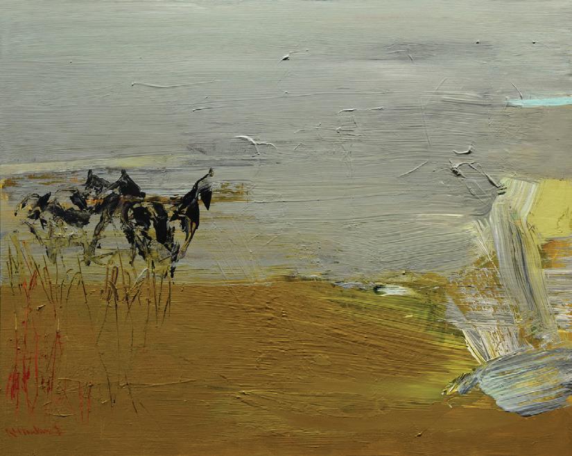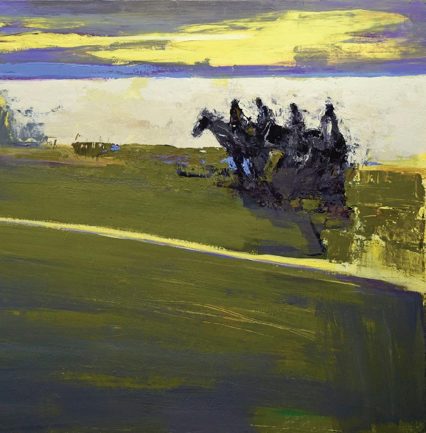 Suggestions of forms—a lone rider, a resolute pine tree—paired with his decisive palette inspire personal, meditative interpretations.