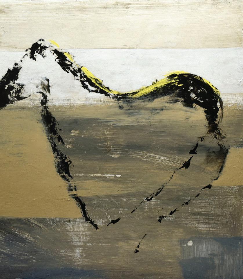 As such, the horse and the rider exist entwined with their enigmatic surroundings, their activity in concert with their conceptual context. Framed by force not by realism, his gestural paintings writhe with wisdom and beauty.
