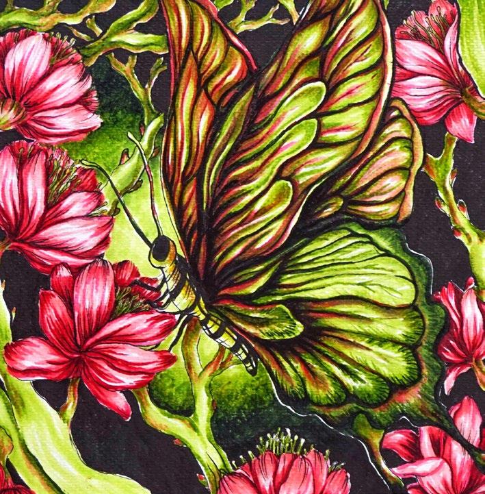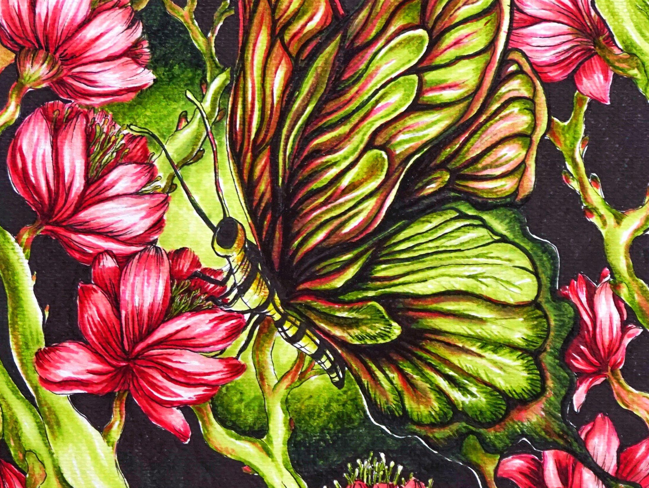 by Jeccah BalgosFor a truly vibrant piece of artwork, try using complementary colors! Green and red are opposite one another on the color wheel, which is why the flowers and the butterfly stand out so distinctly from one another.