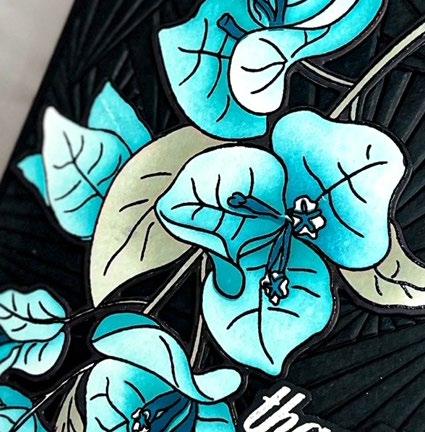 3. Ink up the die-cut image. Use Berry Cool Ink for the flowers, Chamomile Ink for the flower center stem, and Frayed Leaf Ink for the leaves and stem.