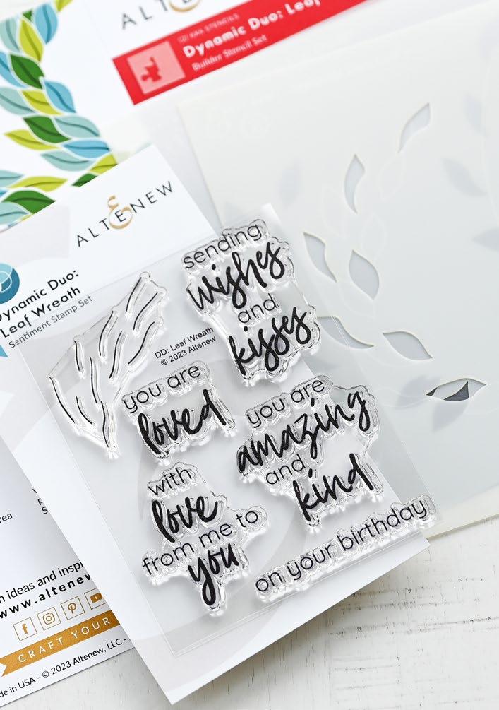 This stamp set will stretch the Leaf Wreath Stencil Set even further with the addition of vein details on the leaves and five accompanying sentiments. Rotate the vein image each time you stamp to complete the full wreath!