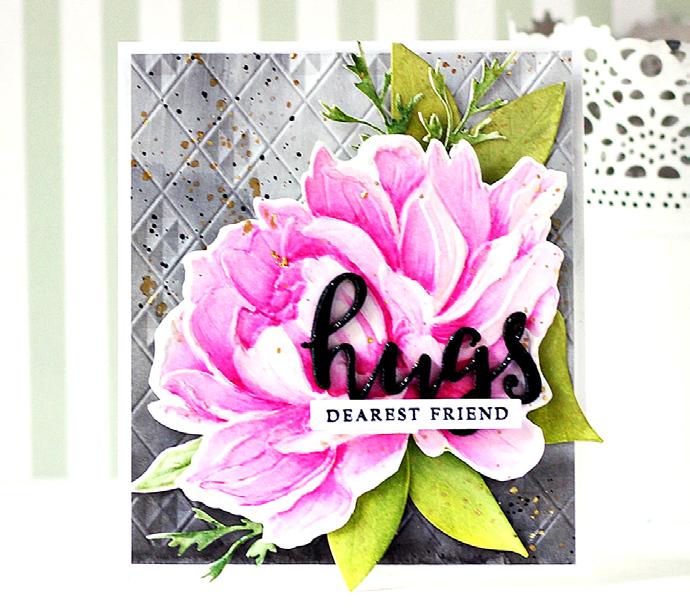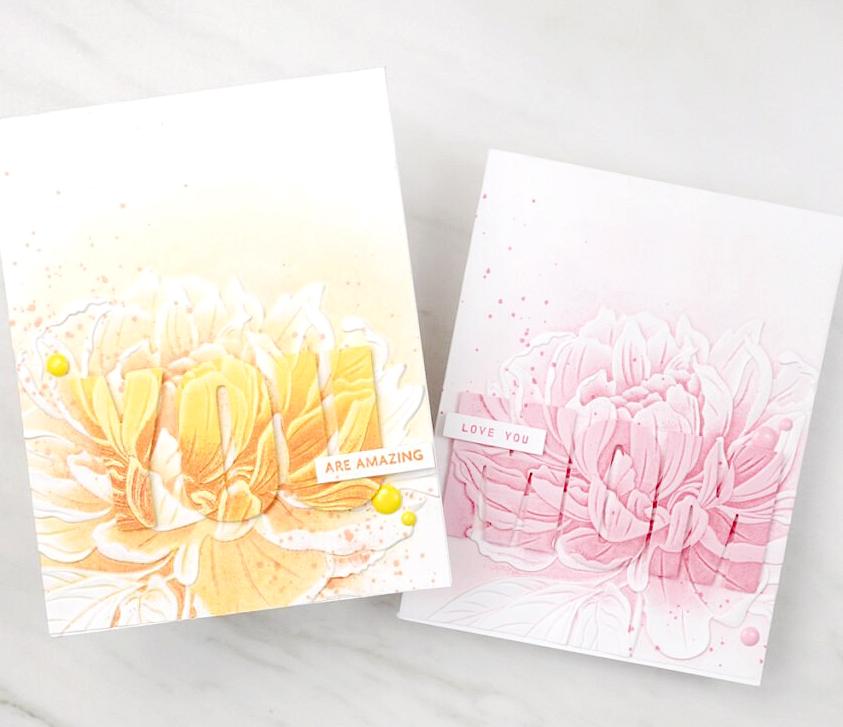 3. Swipe Butter Cream Pigment Ink around the edges of the peony, place the embossed panel inside, and run it through the die-cutting machine again. Repeat the process with Warm Sunshine Pigment Ink (near the peony center) and Caramel Toffee Pigment Ink (in the peony center).