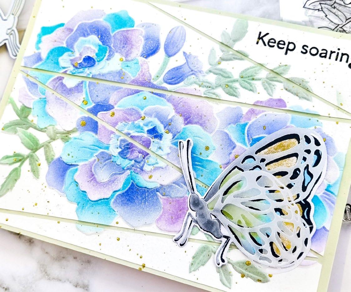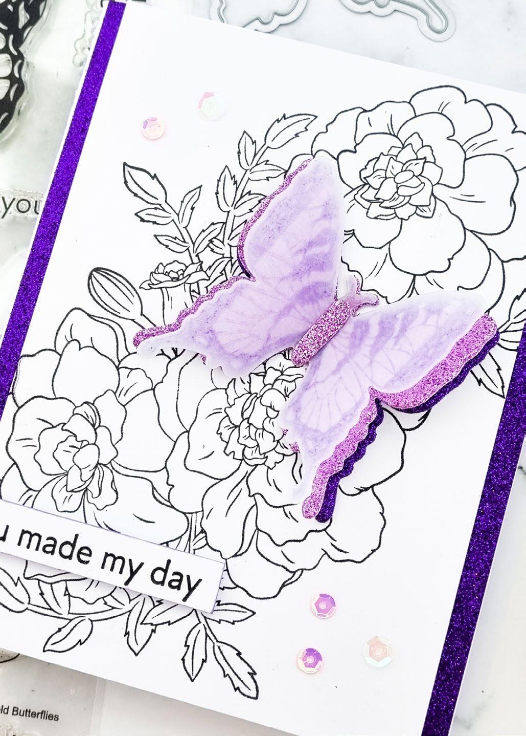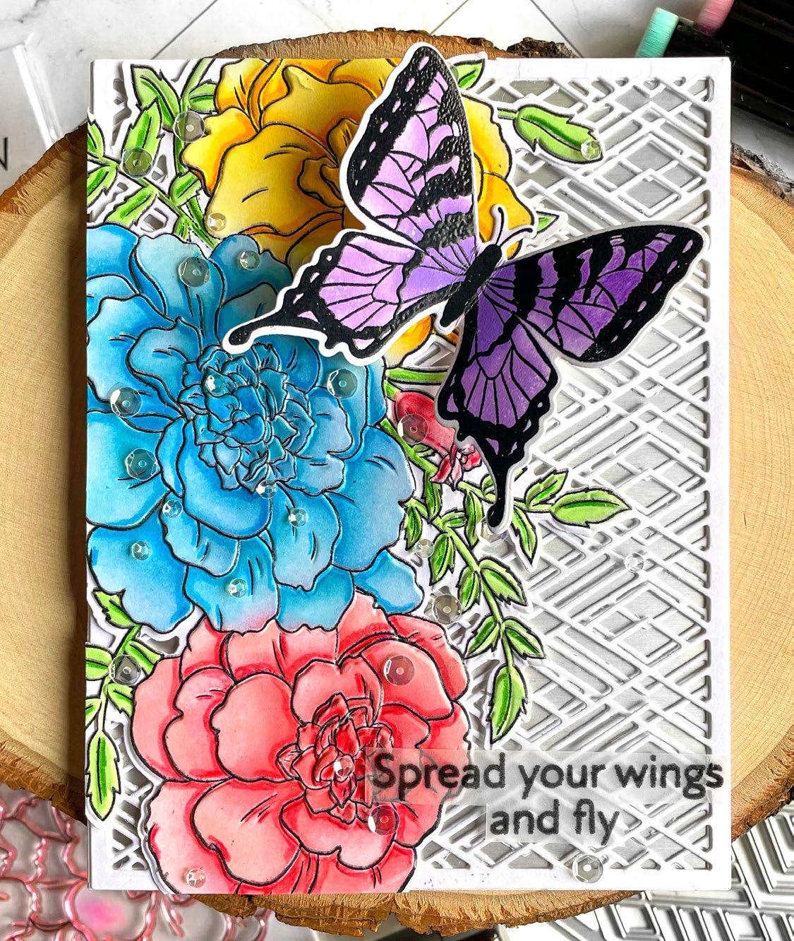 Did you know that the bright colors & rich scent of marigolds are very attractive to butterflies? This elaborate stamp set features two stunning butterflies, a beautiful bouquet of marigolds, and some sweet sentiments to tie everything together perfectly. The flowers come with four simple coloring stencils that can quickly fill up those marigolds in no time!