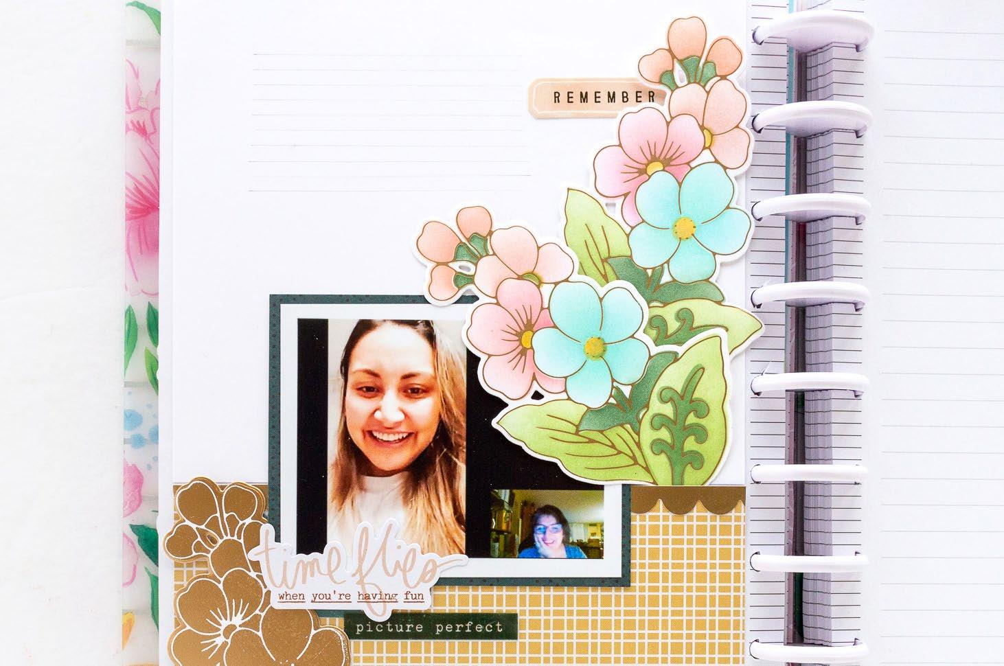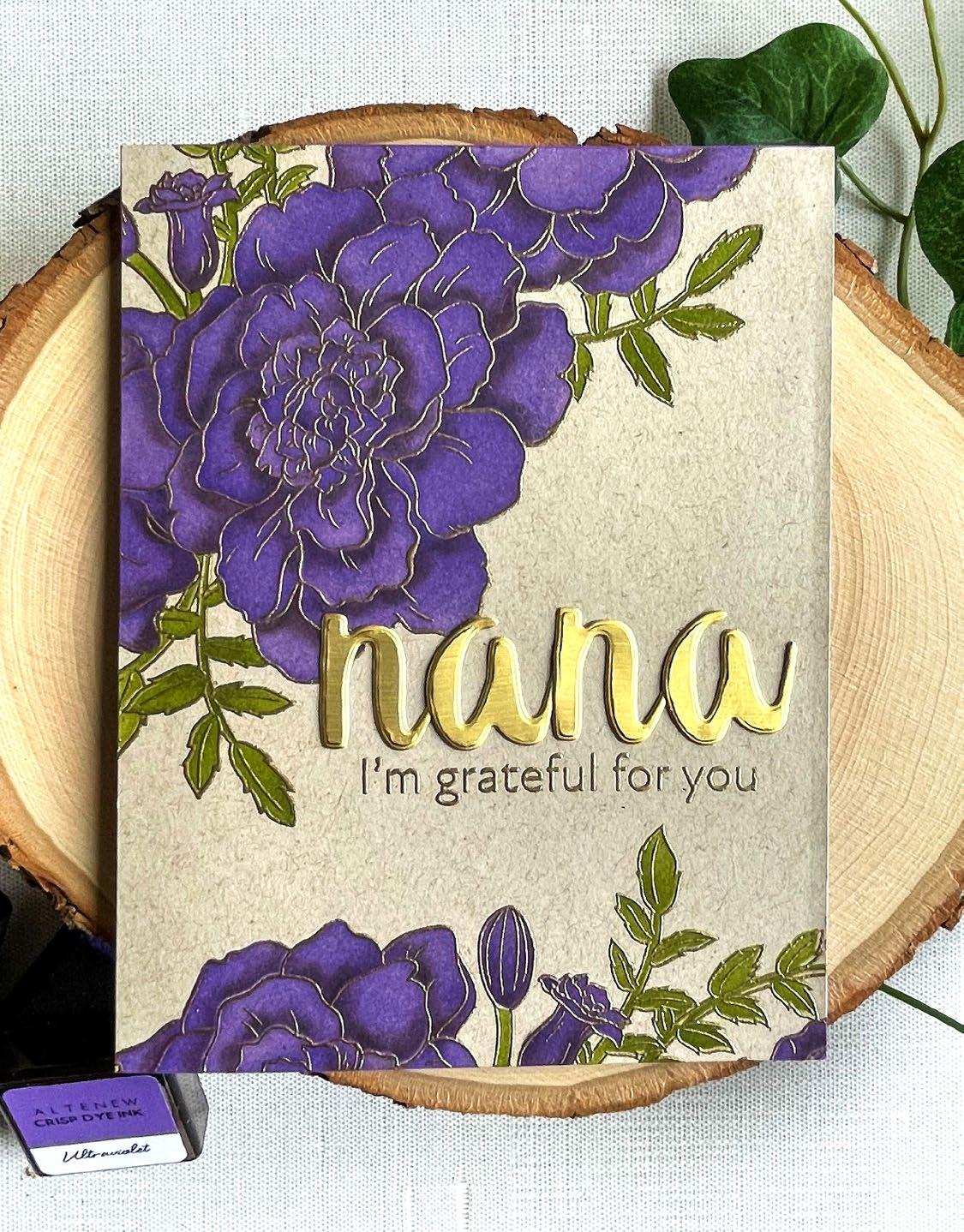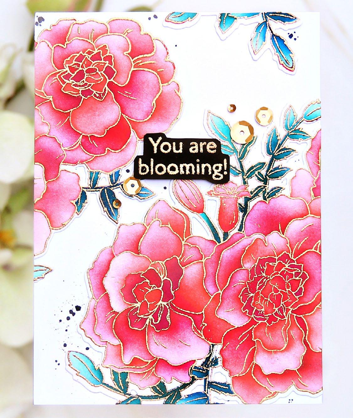 3. Color image using coordinating simple coloring stencils. Use Baby Pink, Pinkalicious and Rubellite Inks for the flowers and Silver Sage, Jade, Eucalyptus and Forest Fern Fresh Dye Inks for the leaves.