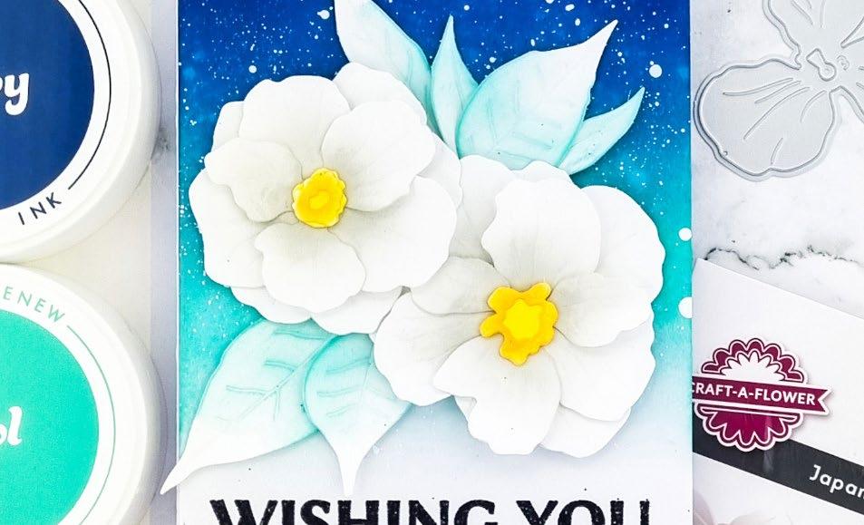 Create realistic Japanese camellias with this die set! They are known for their glossy dark green leaves and beautiful, large flowers. The flowers have a distinct shape with overlapping petals and a prominent cluster of yellow stamens in the center.