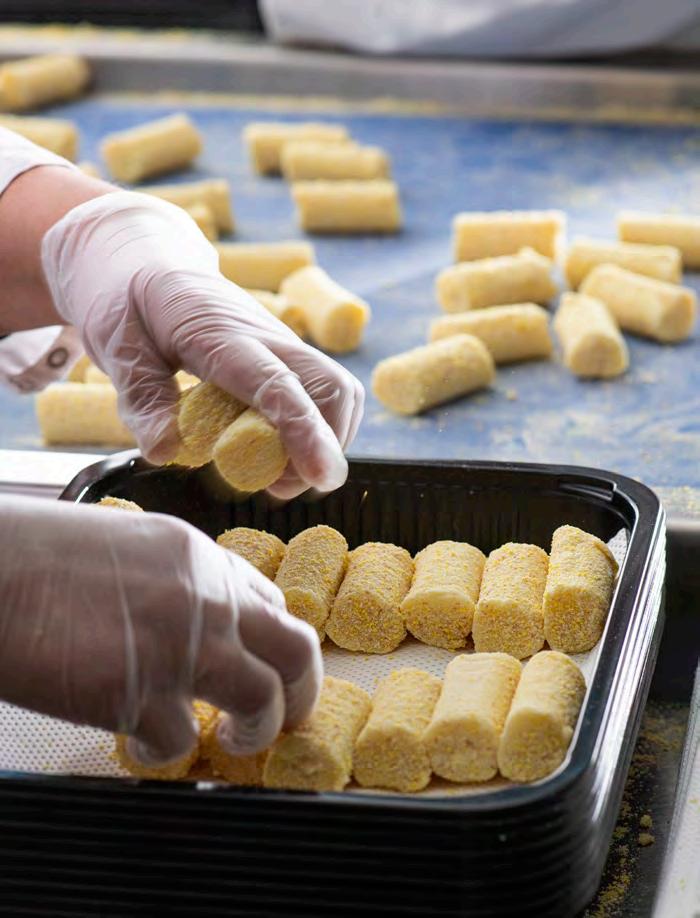 De kroketten worden stuk voor stuk met de hand in de schalen gelegd en onder beschermende atmosfeer verpakt.