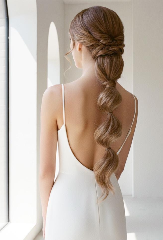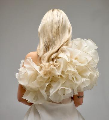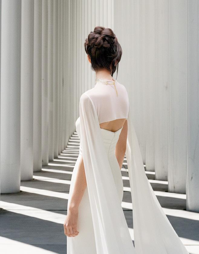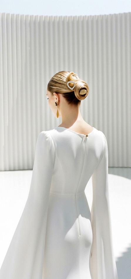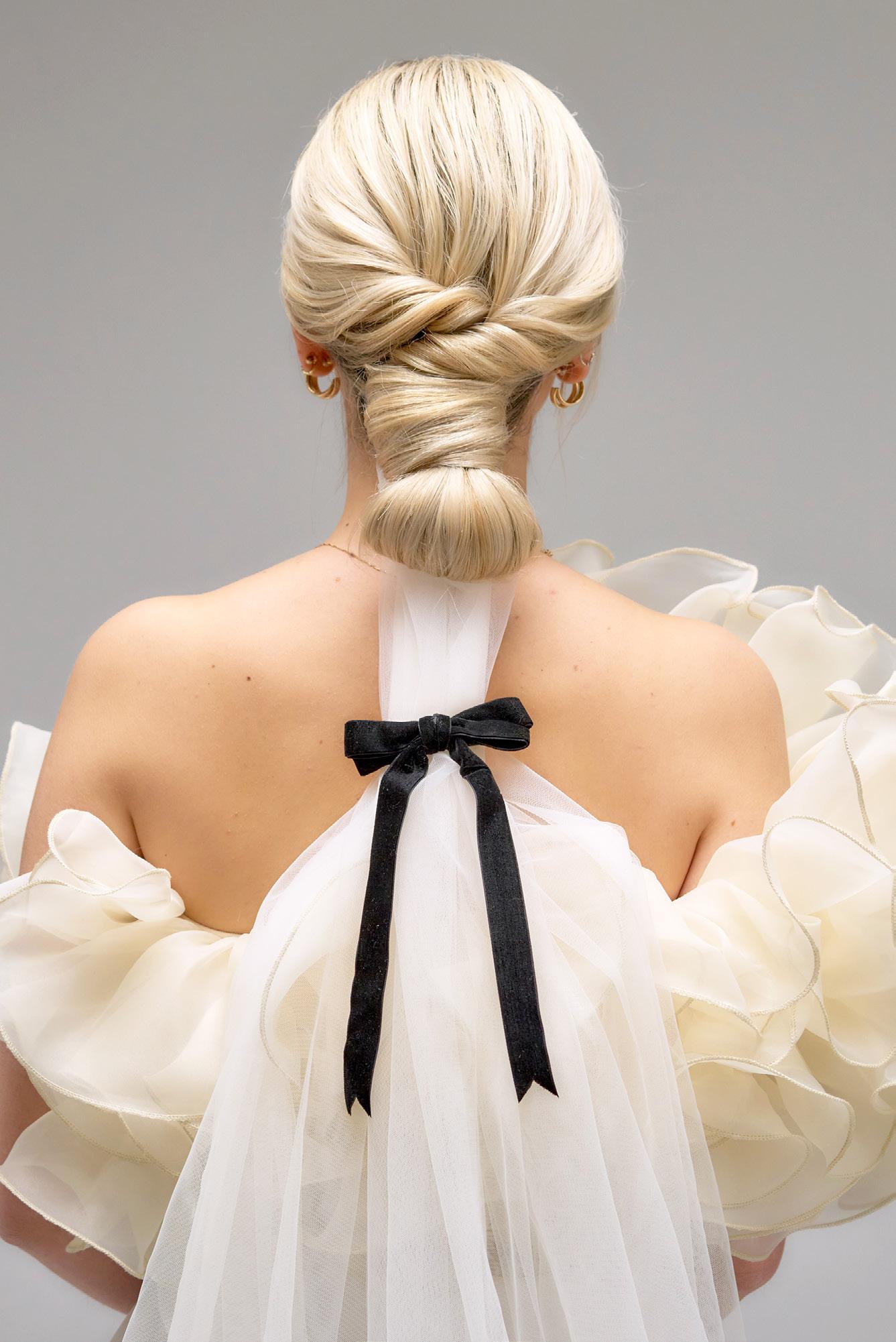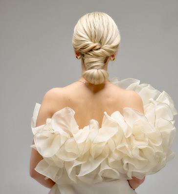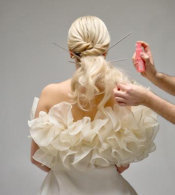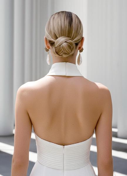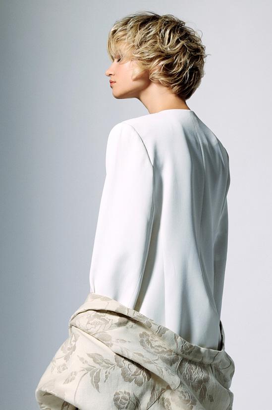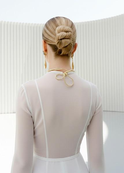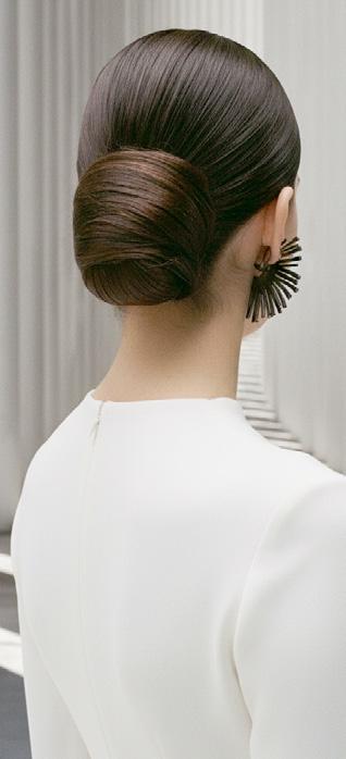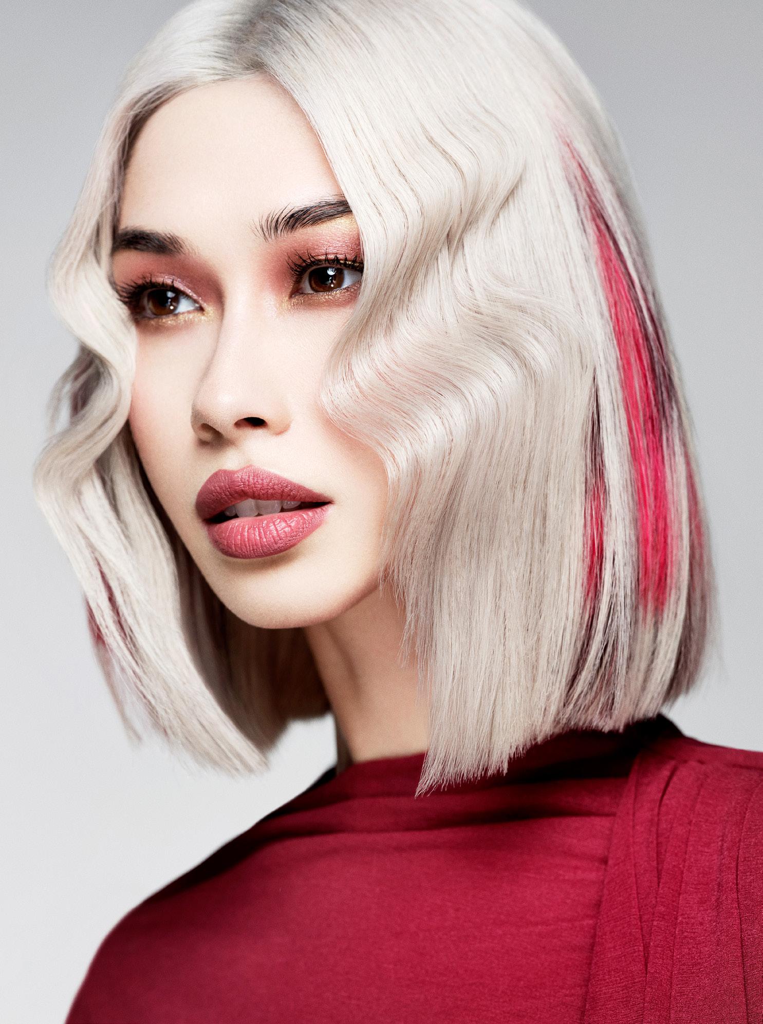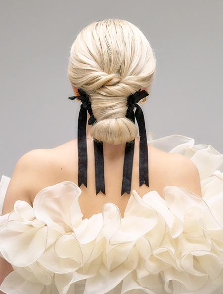 En la parte de corte, dos universos modulares: Un cuadrado corto estructurado, rebosante de luz gracias al tónico Blondorplex. Un pixie corto con flequillo, firme y vibrante, intensificado por Color Touch (certificado vegano) para un castaño profundo y brillante. Lazos refinados y sensuales sublimados por Shinefinity para un rubio con reflejos sedosos, como un eco de la delicadeza de las flores y la gracia de las ceremonias asiáticas.