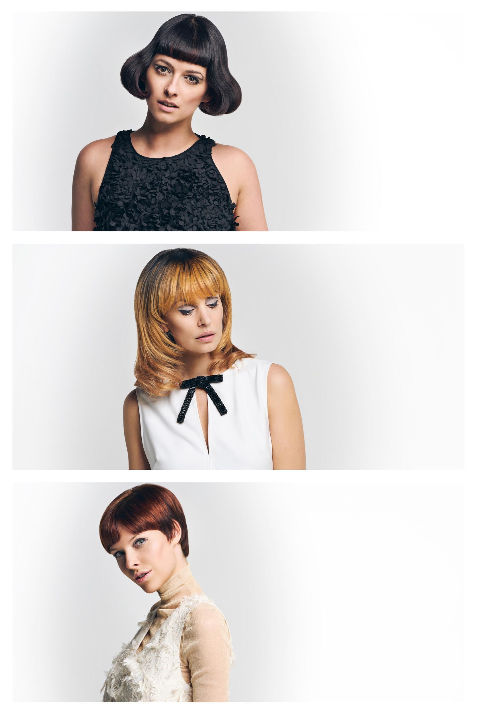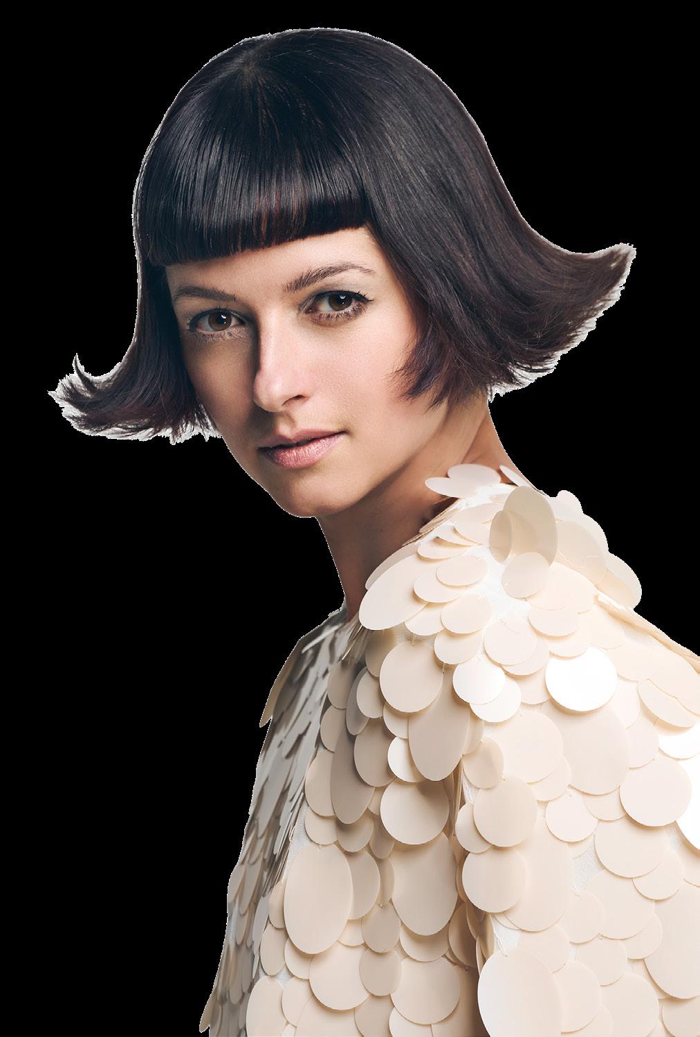 Retro Flip Chic: bob oscuro y brillante con flequillo gráfico y puntas volteadas – un guiño a la alta costura Mod de fi nales de los 60.