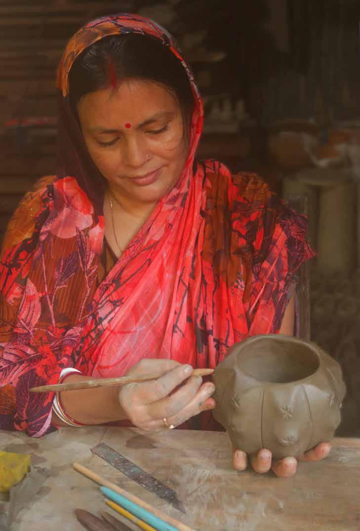 Un ampio ventaglio di tecniche di lavorazione ha dato vita alla proposta: tessitura al telaio tradizionale e tessitura ikat, blockprinting, serigrafia artigianale, pittura a mano libera, ricamo kantha, patchwork, tornitura, lavorazione a stampo, modellamento e smaltatura manuali, nonché l’intreccio nelle sue varie versioni.