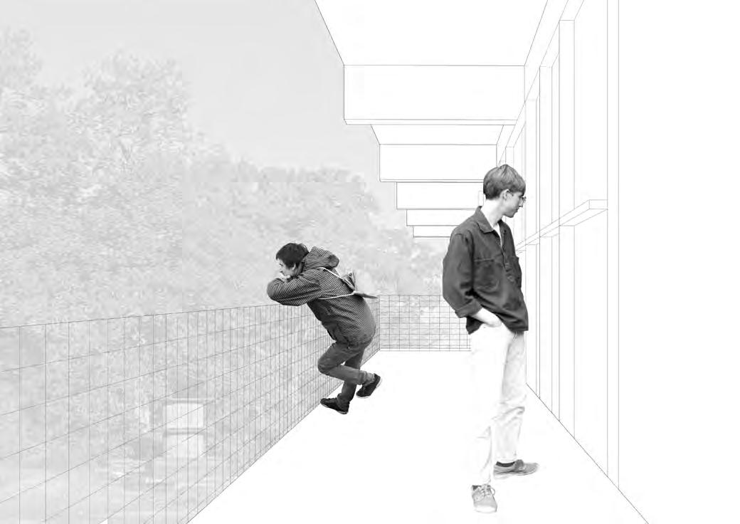 The building’s design is based on simplicity and modularity: a framework of precast concrete columns and slabs that land lightly on the gravel field behind the skate park. The facade is expressed by the variation of room heights inside and is interrupted by balconies facing the sports field.