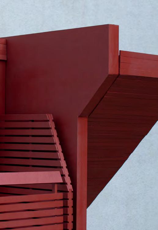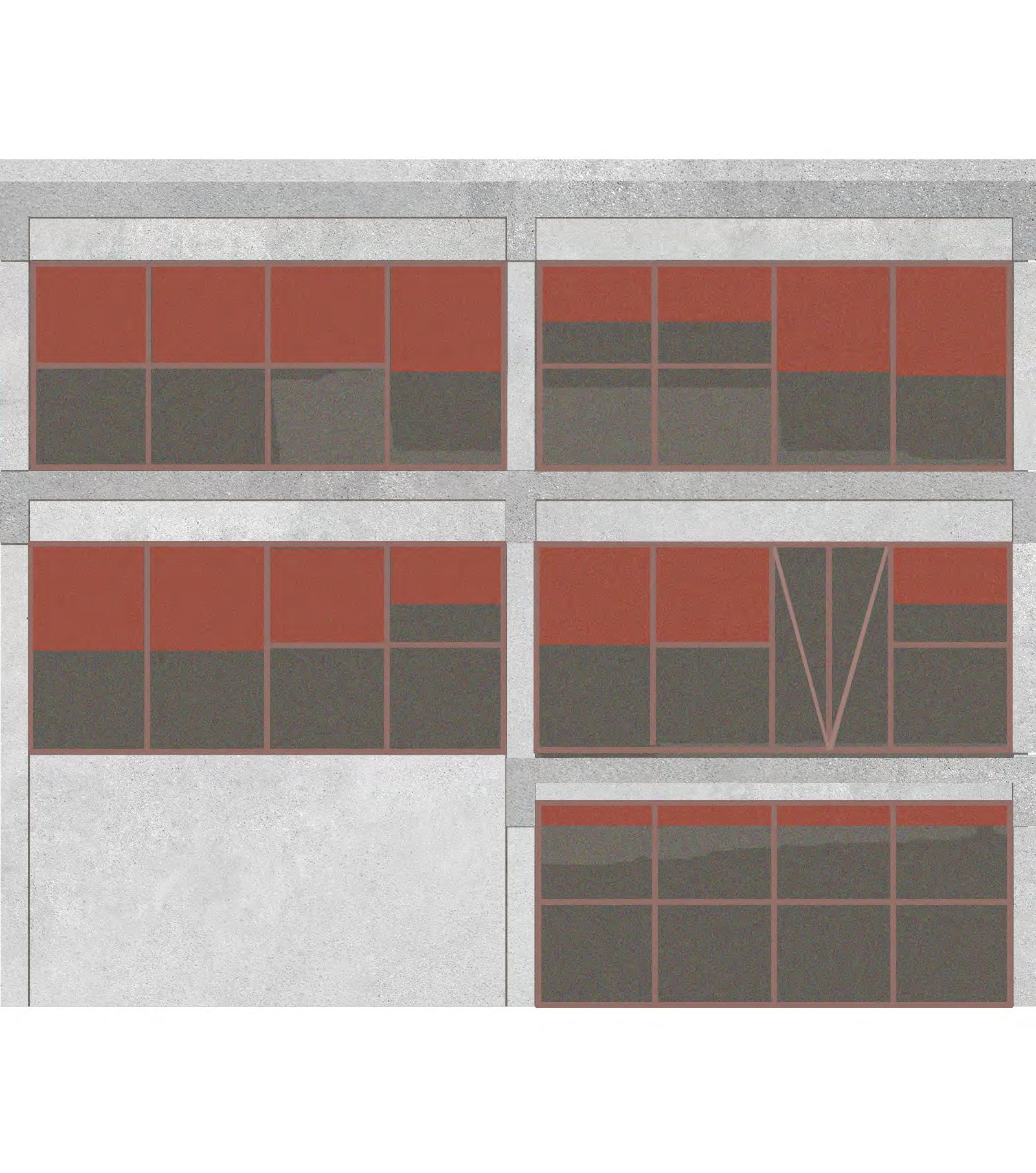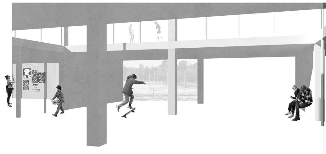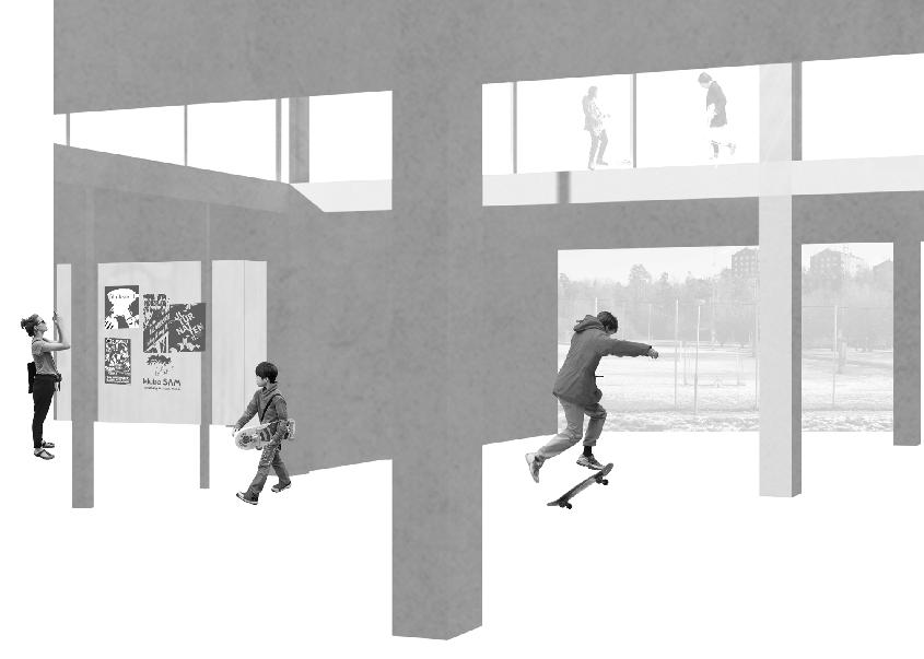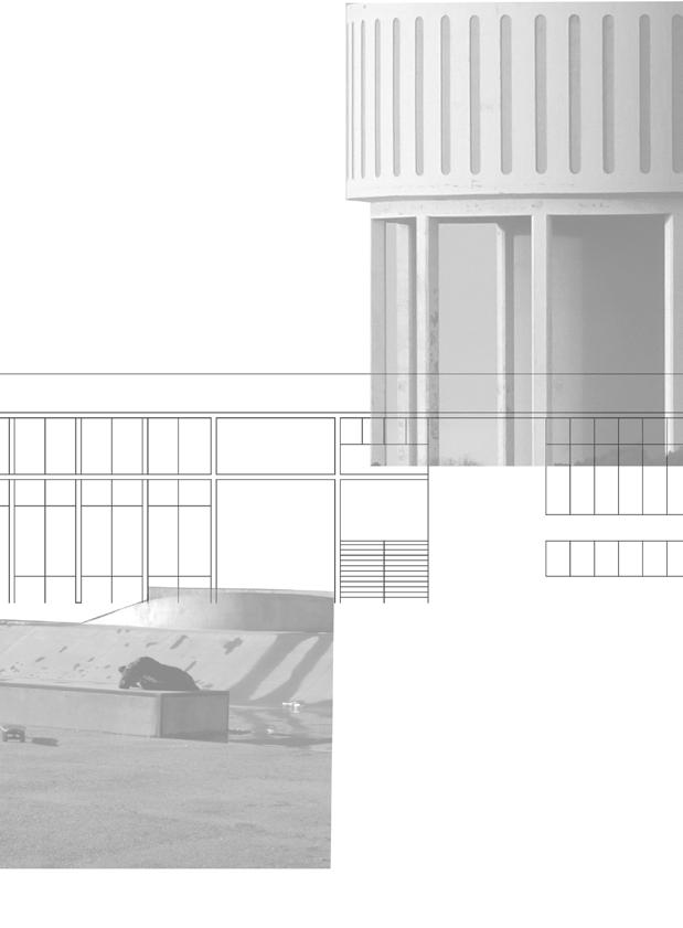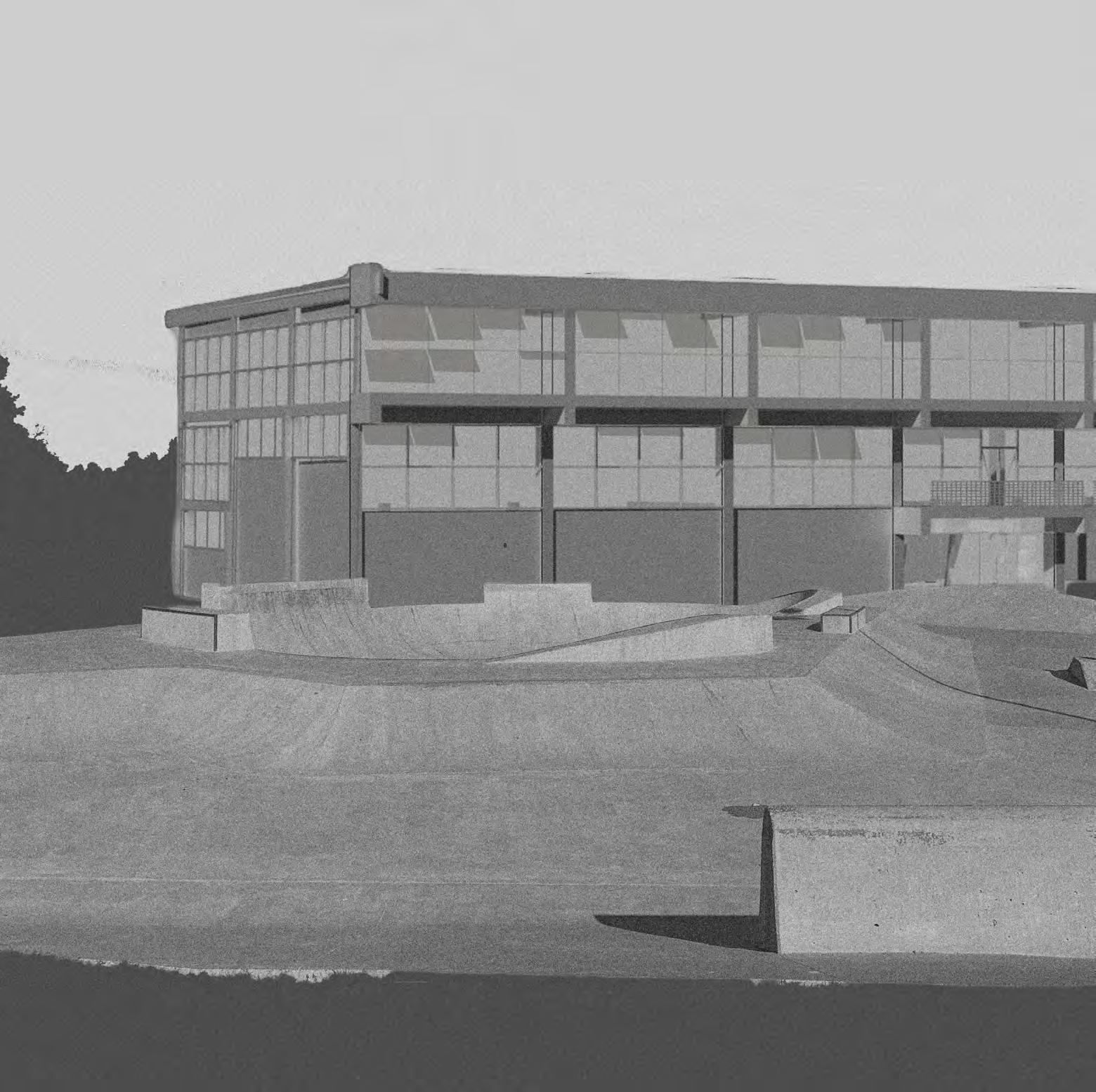 Byggnadens utformning tar avstamp i det enkla och modulära: en stomme av pelare och skivor i prefabbetong som landar lätt på grusplanen bakom skateparken. Fasaden får sitt uttryck av variationen av rumshöjd innanför och bryts av med balkonger som vetter ut mot idrottsplatsen.