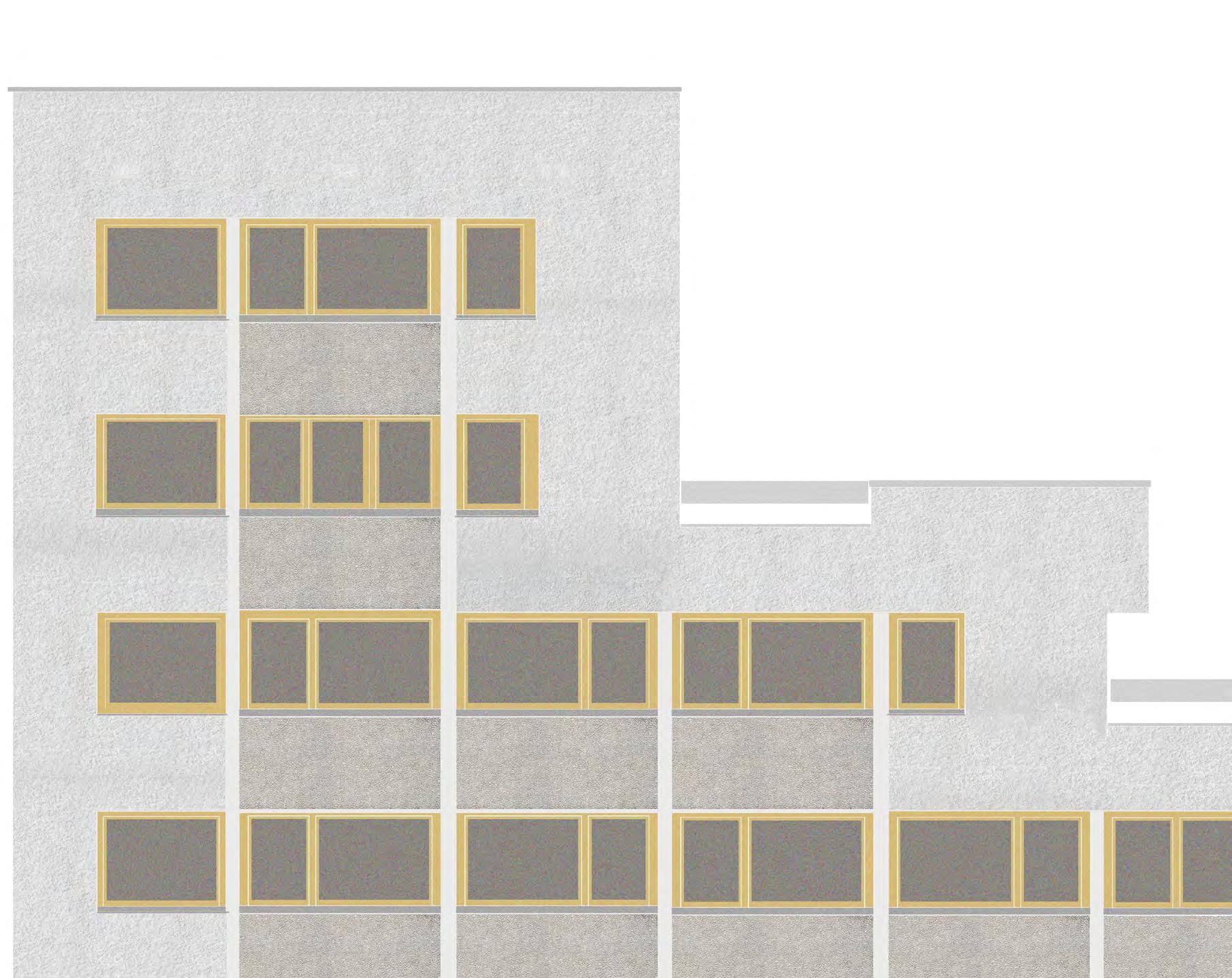 Balkongerna vilar på balkar som kommer ut i fasaden. Glasrutorna sitter i ett ramverk av stål. Interiört kläs installationsväggar in med plywood och rum delas upp av gardiner och vikväggar. Tanken är att strukturens enkelhet ska inbjuda till ommöblering och flexibilitet.
