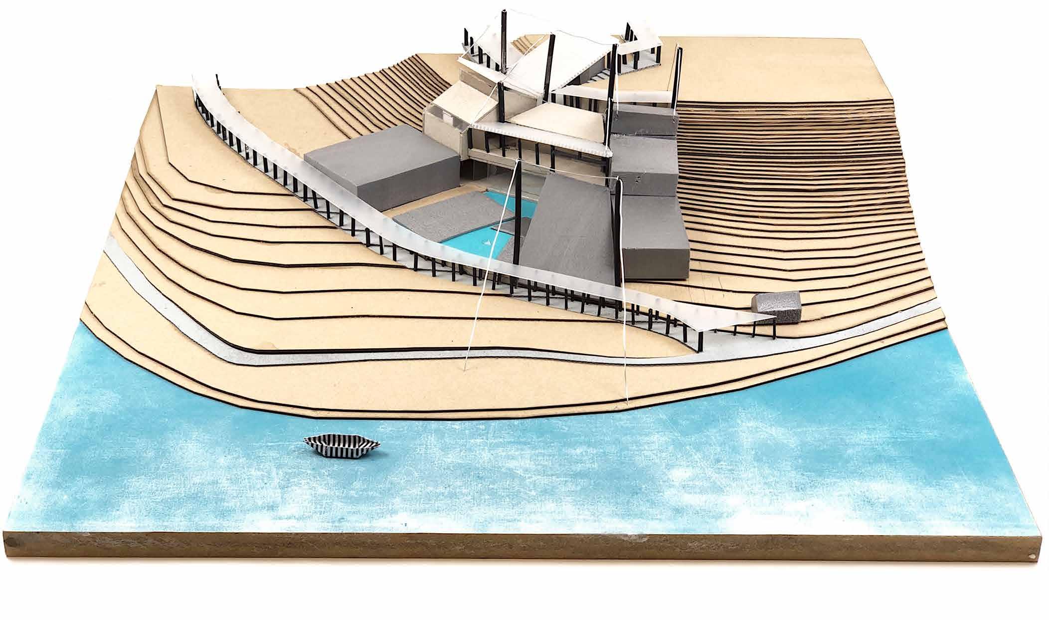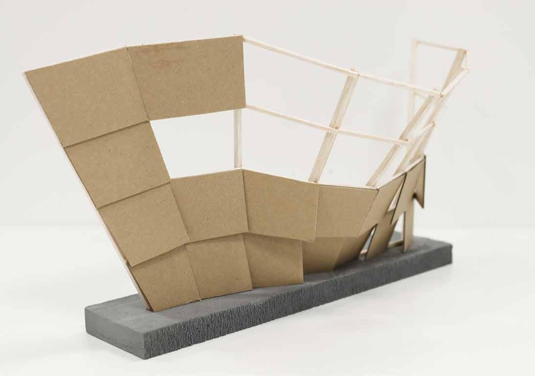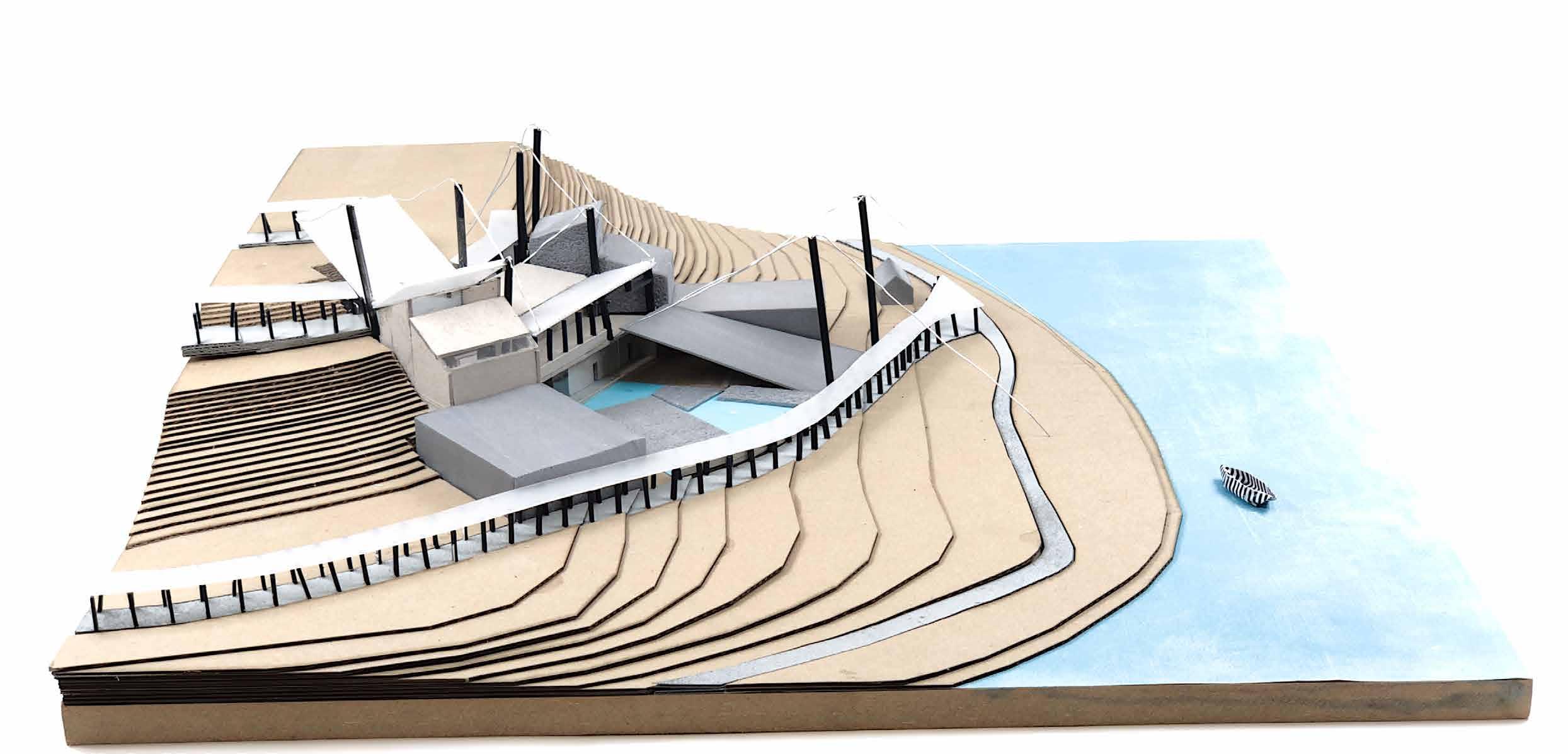 and pathways were spray-painted before the cardboards were glued to achieve the topography. Due to inappropriate scale, the boat-like tectonics was modelled in limited details. However, the mast-suspended roofs were created by passing thin metal wires through polycarbonate sheets