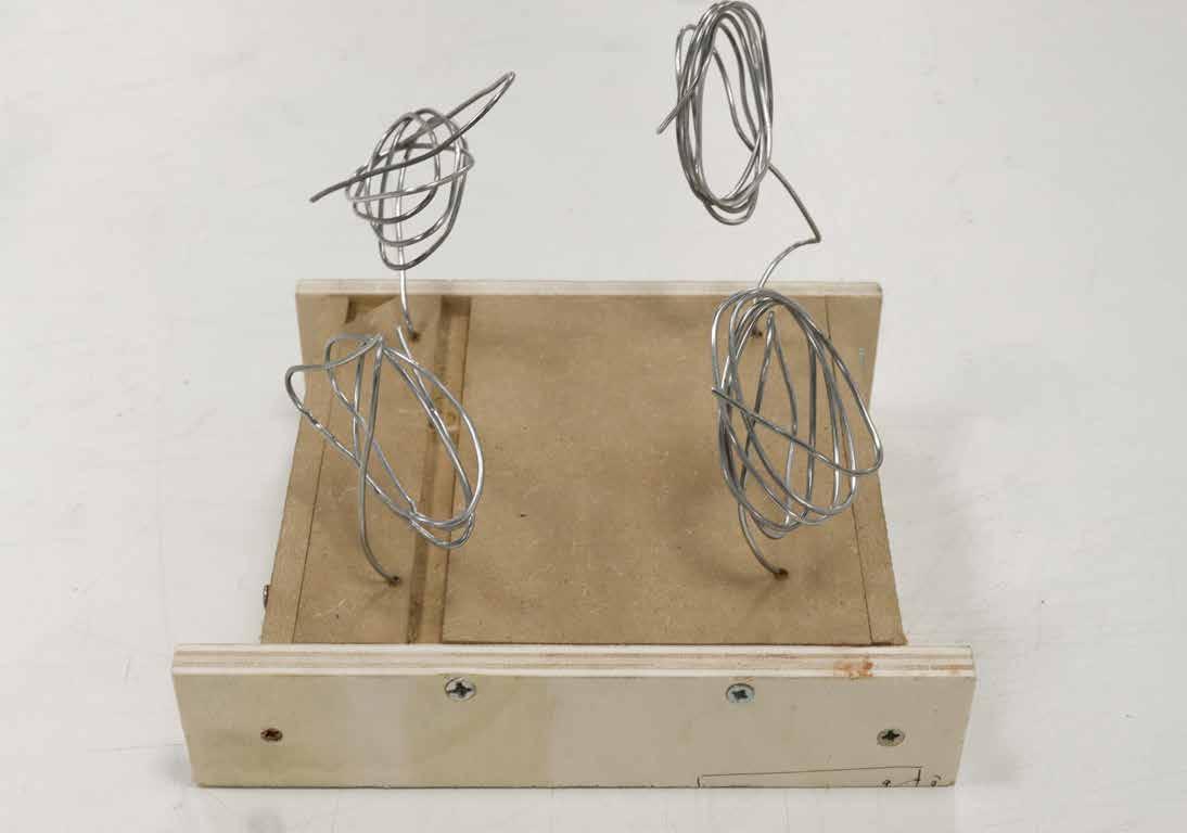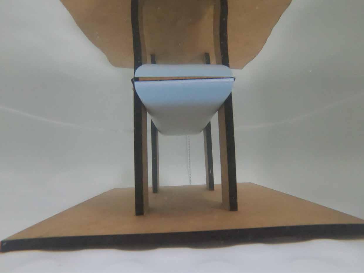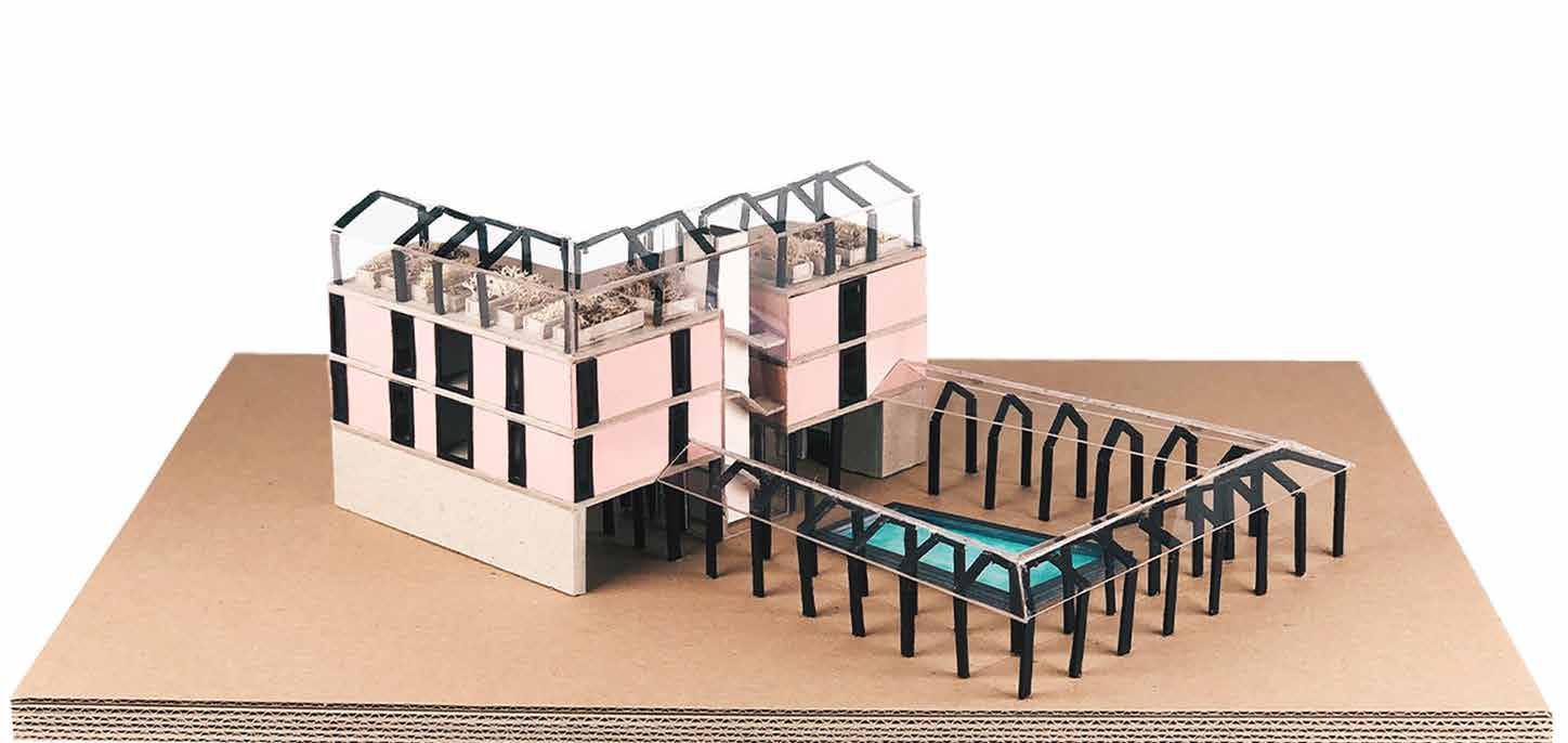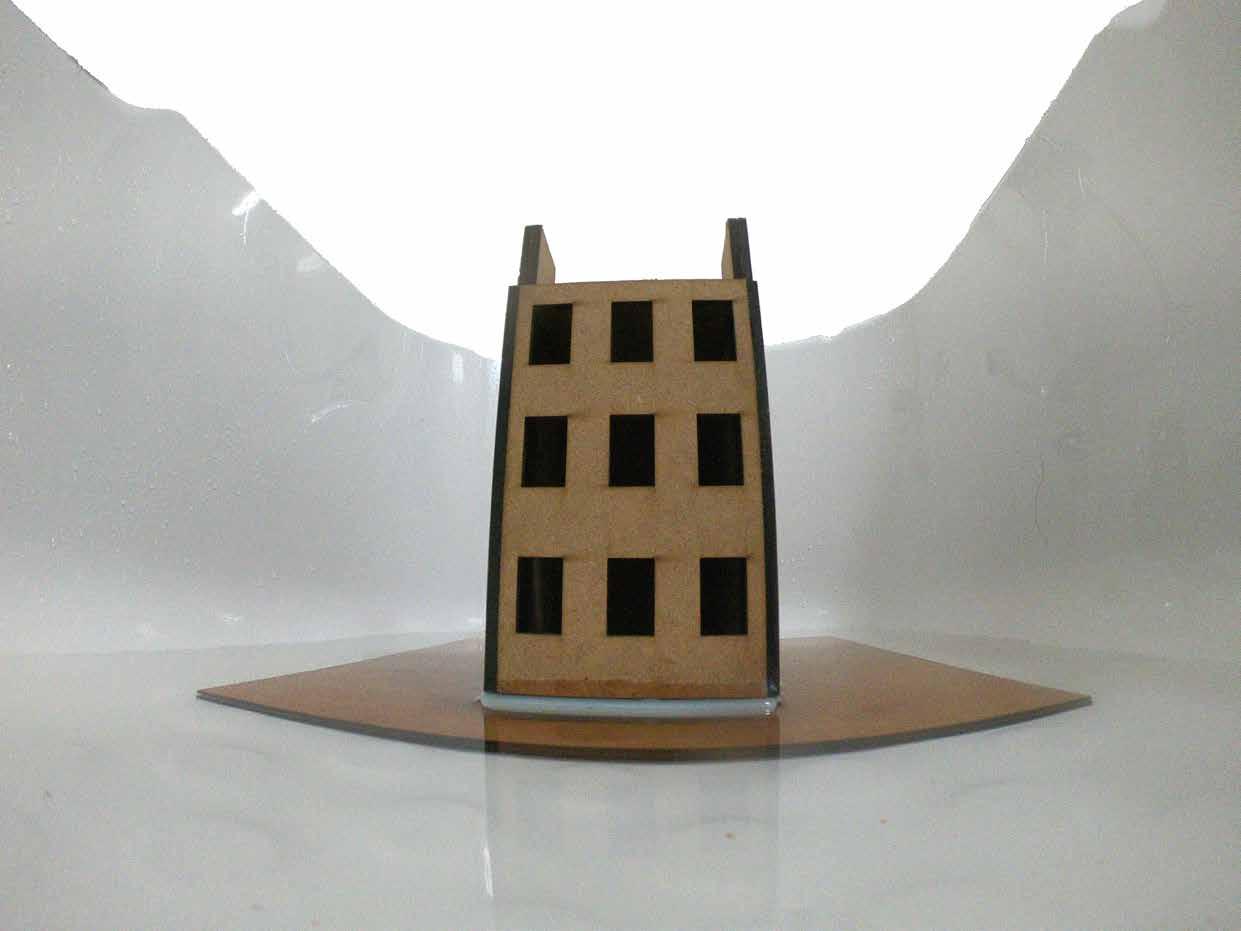and pathways were spray-painted before the cardboards were glued to achieve the topography. Due to inappropriate scale, the boat-like tectonics was modelled in limited details. However, the mast-suspended roofs were created by passing thin metal wires through polycarbonate sheets