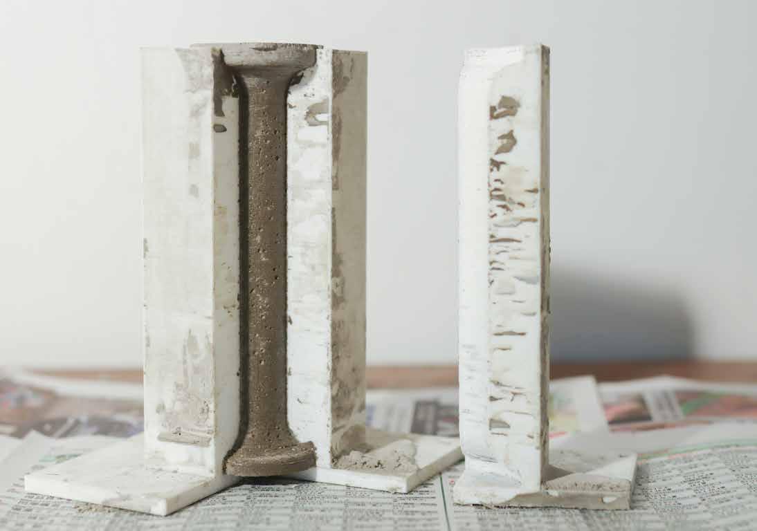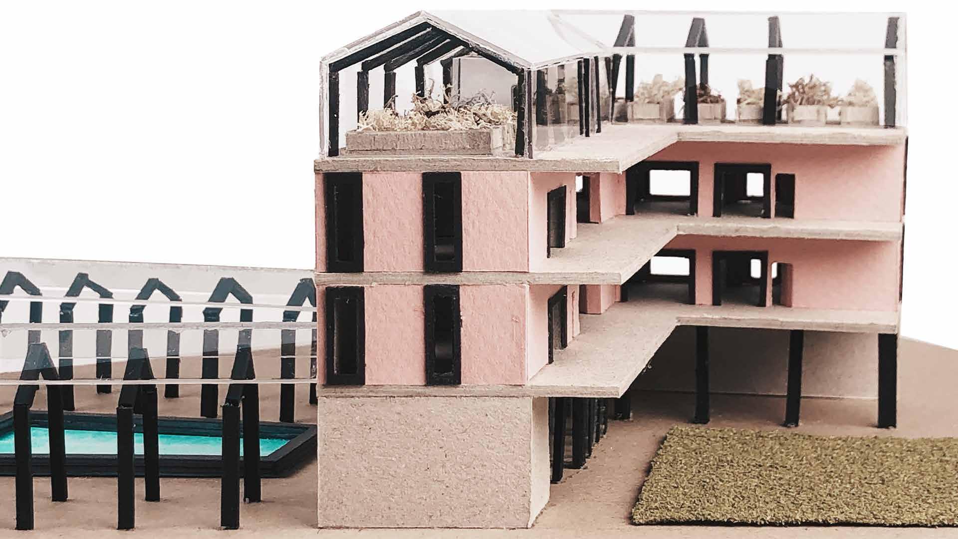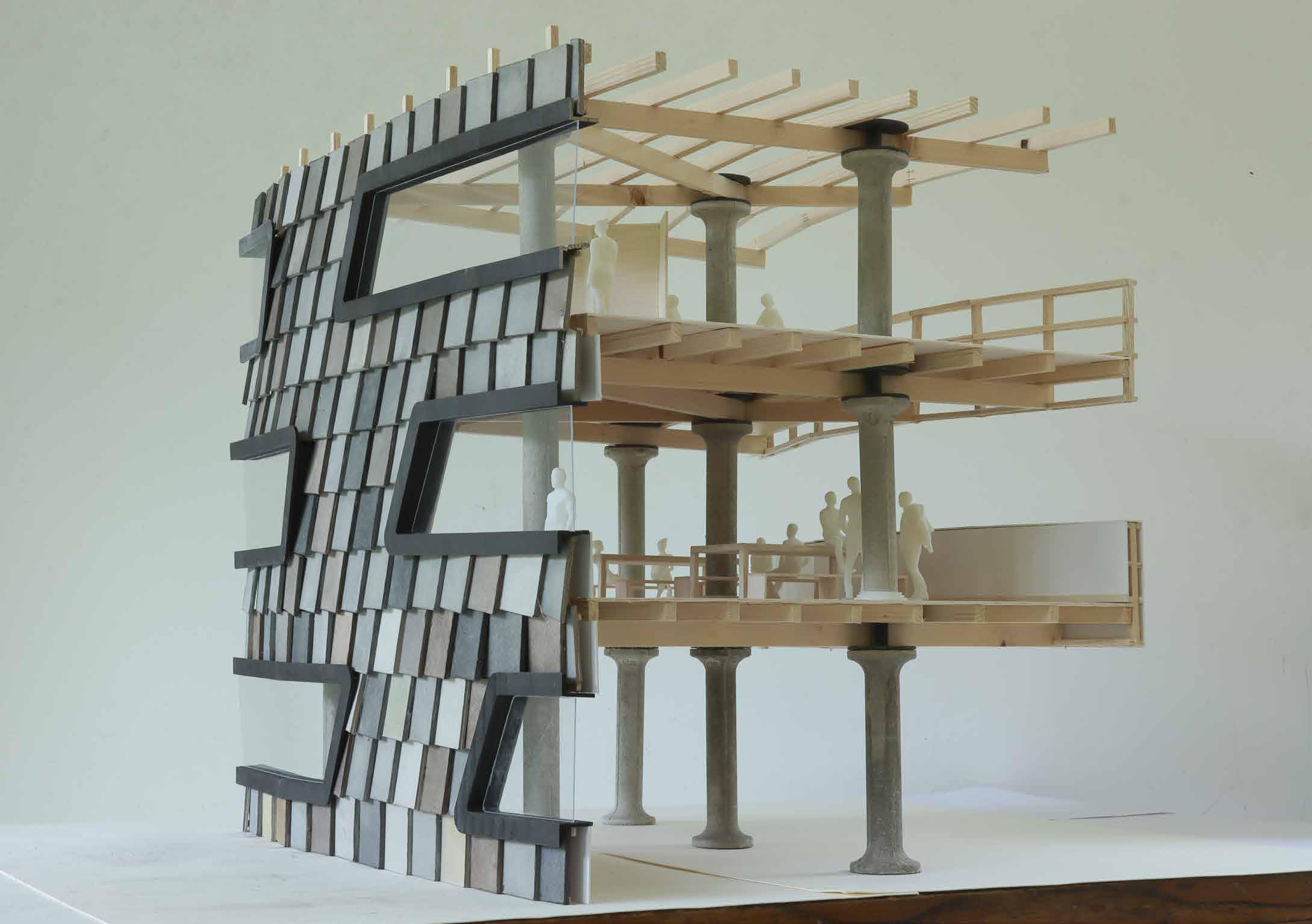 On Rhinoceros 3D the 1:20 model was first designed. Concrete columns were casted in 3-D printed moulds and wooden beams were created by carpentry The cardboard cladding were chalk-brushed, and windows were created by laser cutting. The column skirtings and human figures were created by SLA resin 3-D printing.