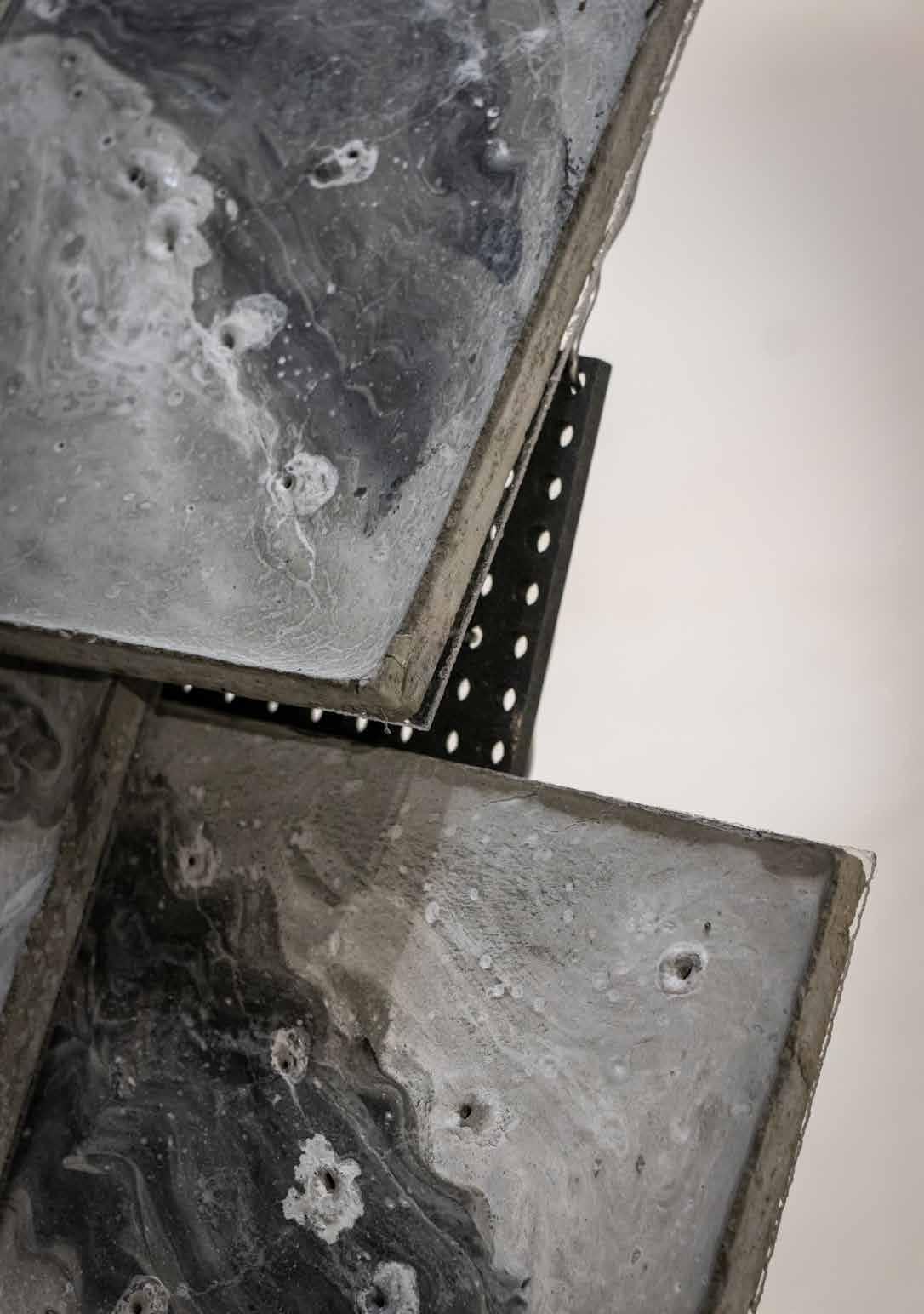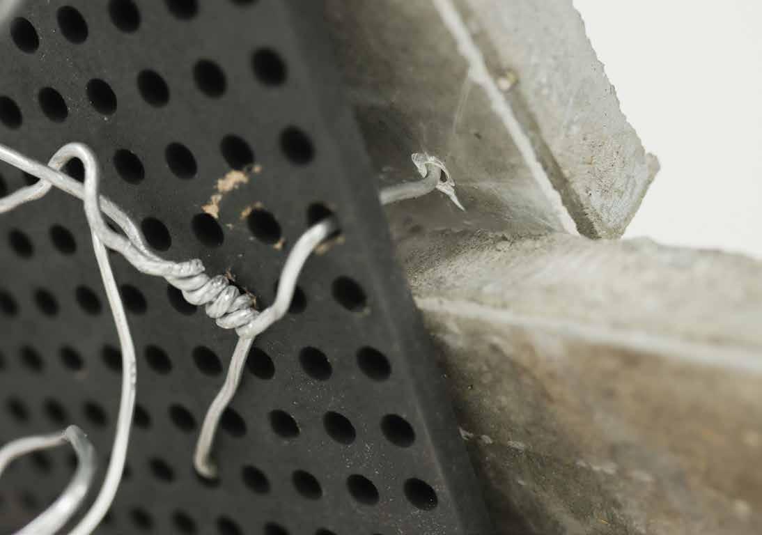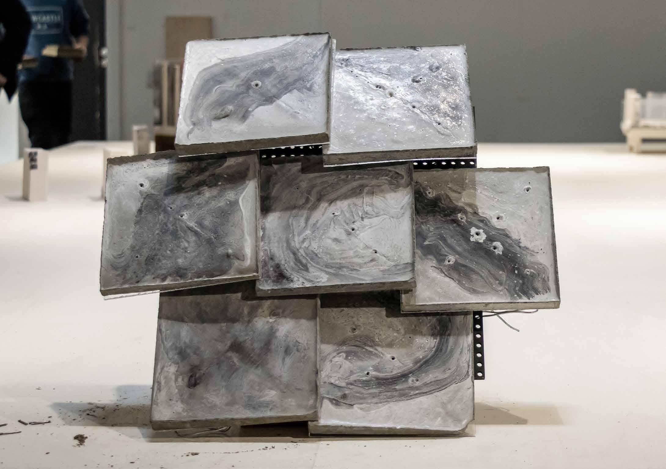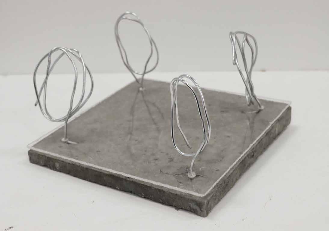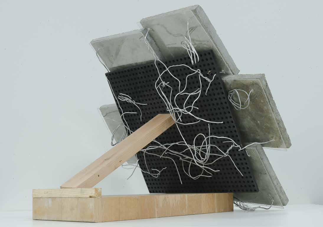 The façade exploration (n.t.s.) was created in Think Through Making week. The casted concrete tiles were reinforced with wires and mesh. The wires extend so that the tiles attach to the laser-cut MPF.