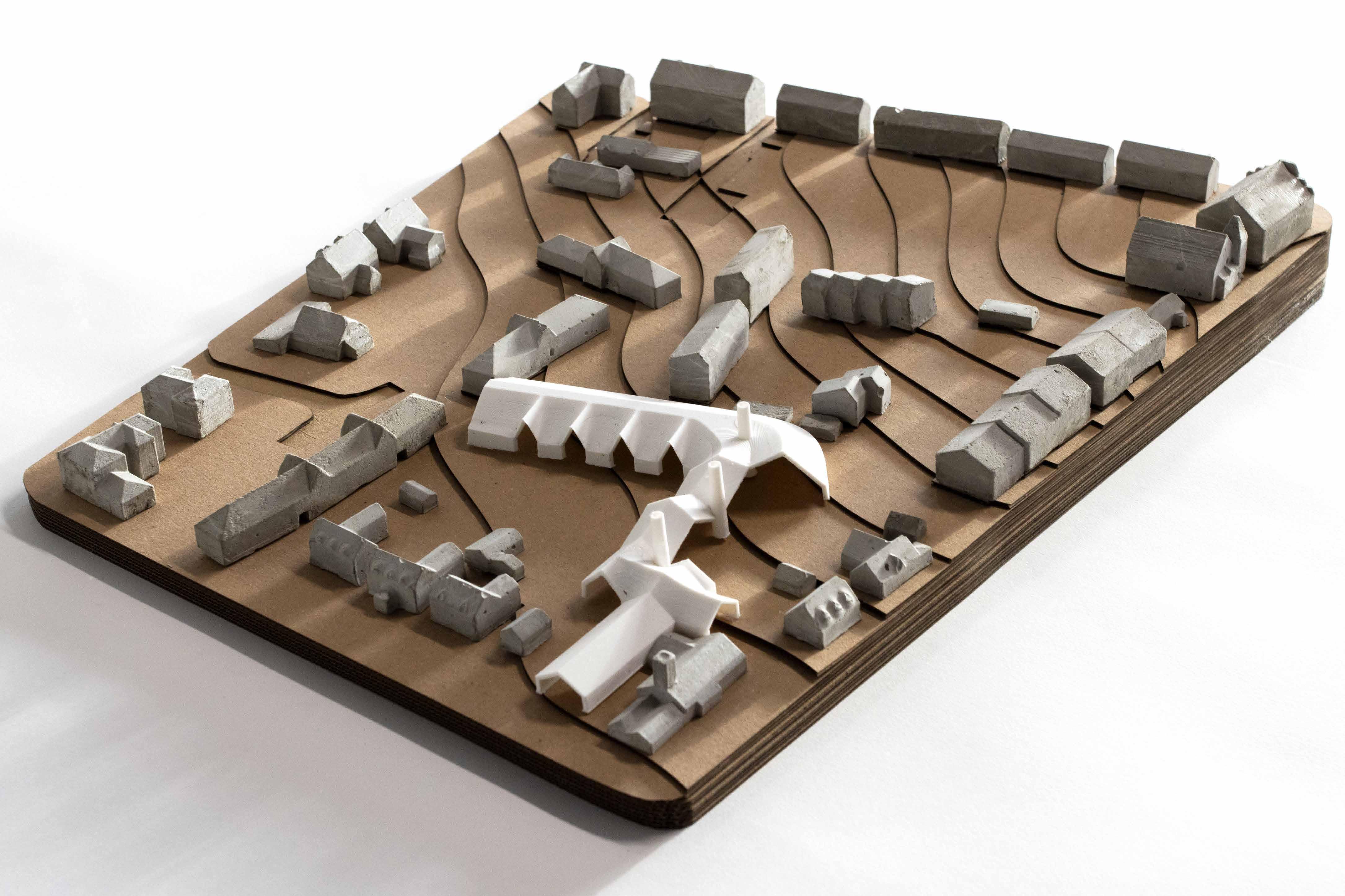 The 1:500 site model was created by laser cutting, based on OS data and 3D modelling. Its contextual buildings were first 3D printed. ‘Negative’ molds were then created by silicon casting. Finally, concrete was casted into the silicon molds.