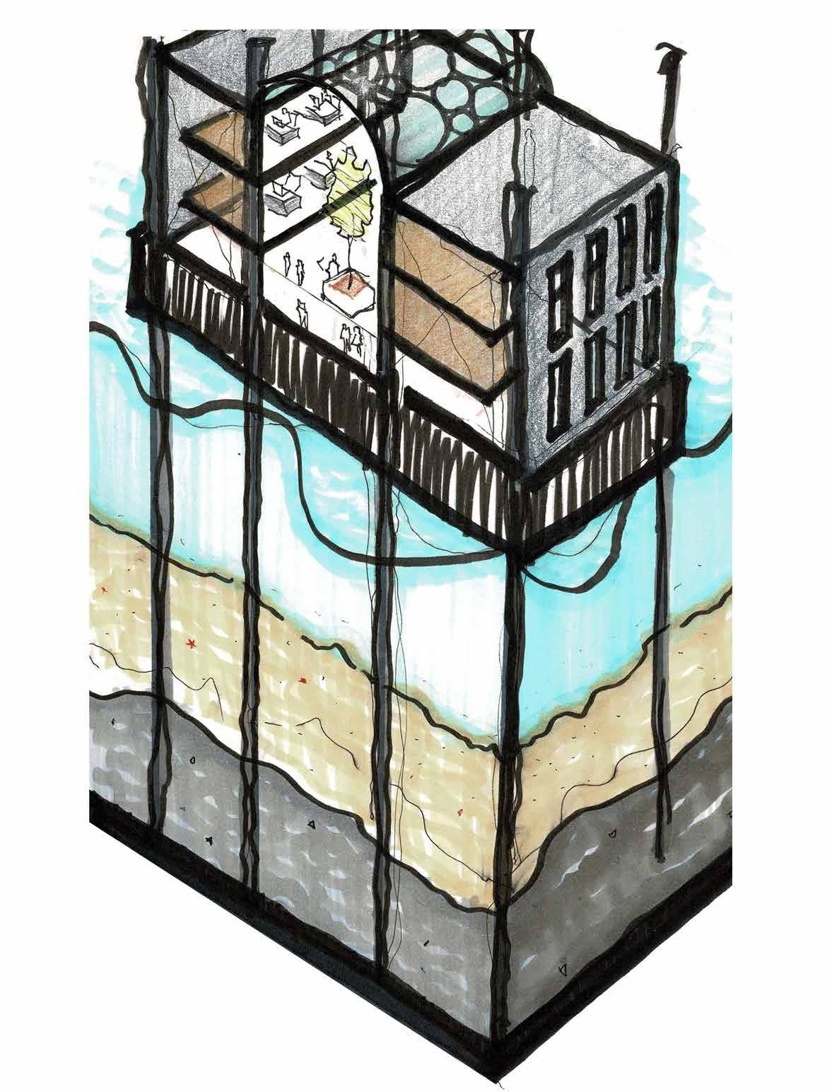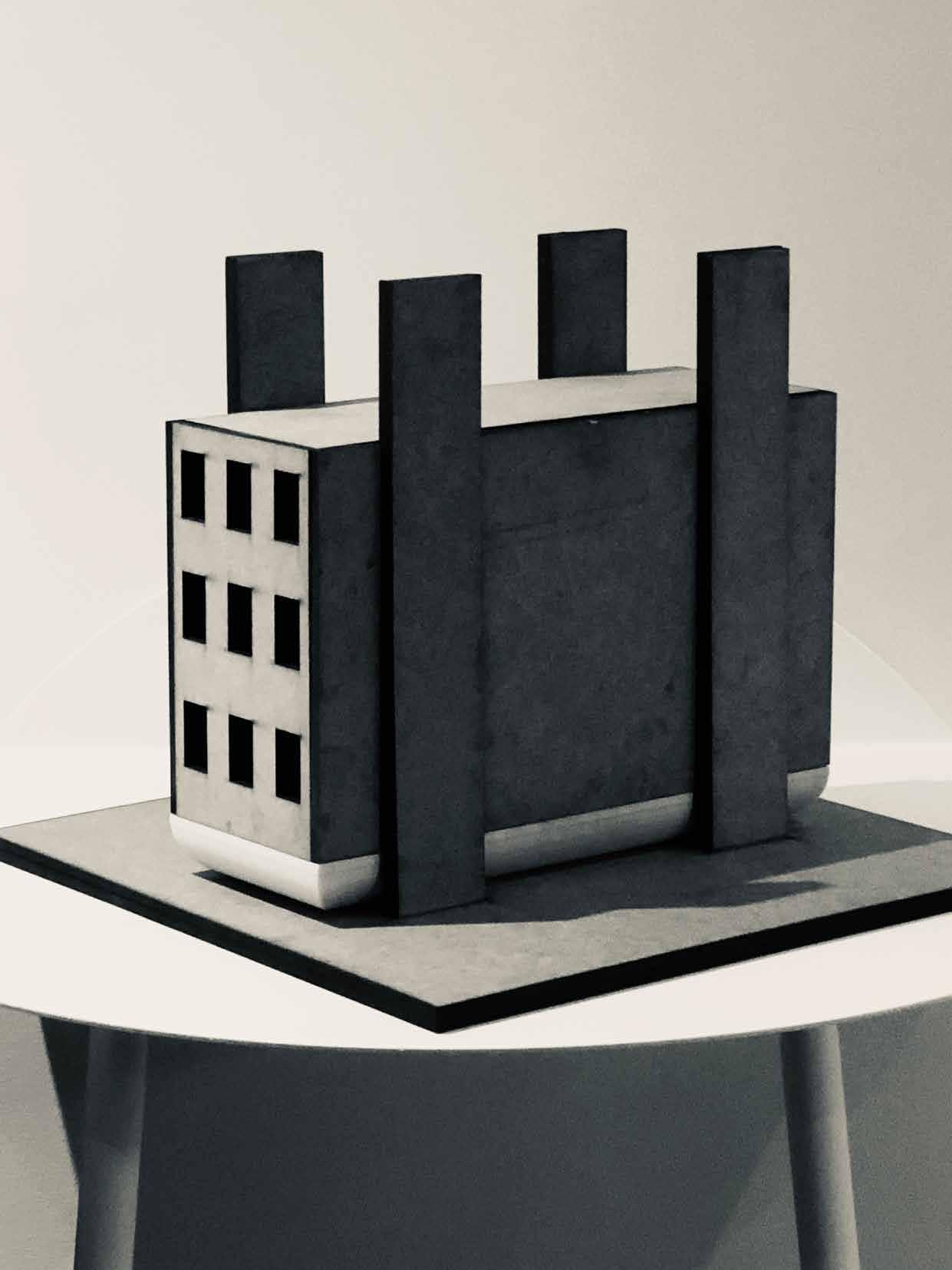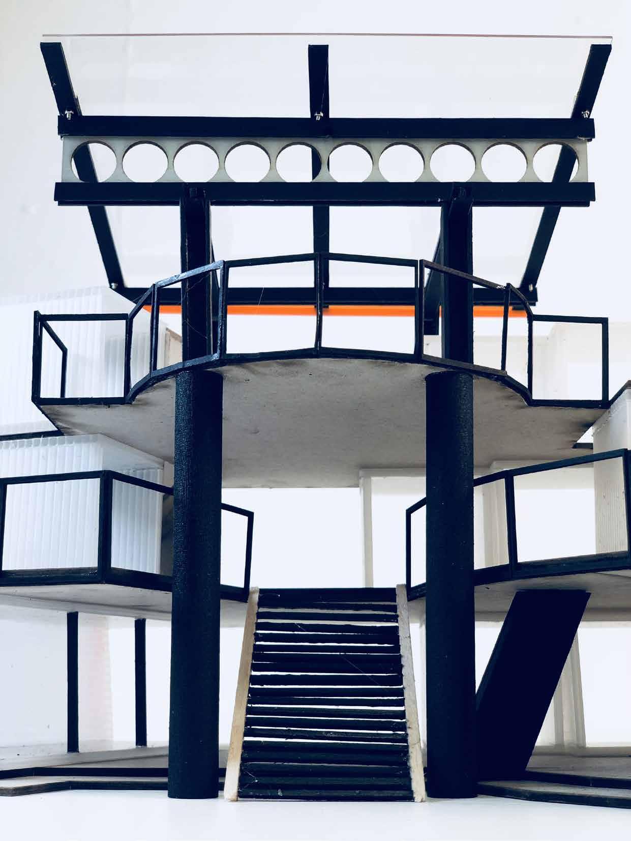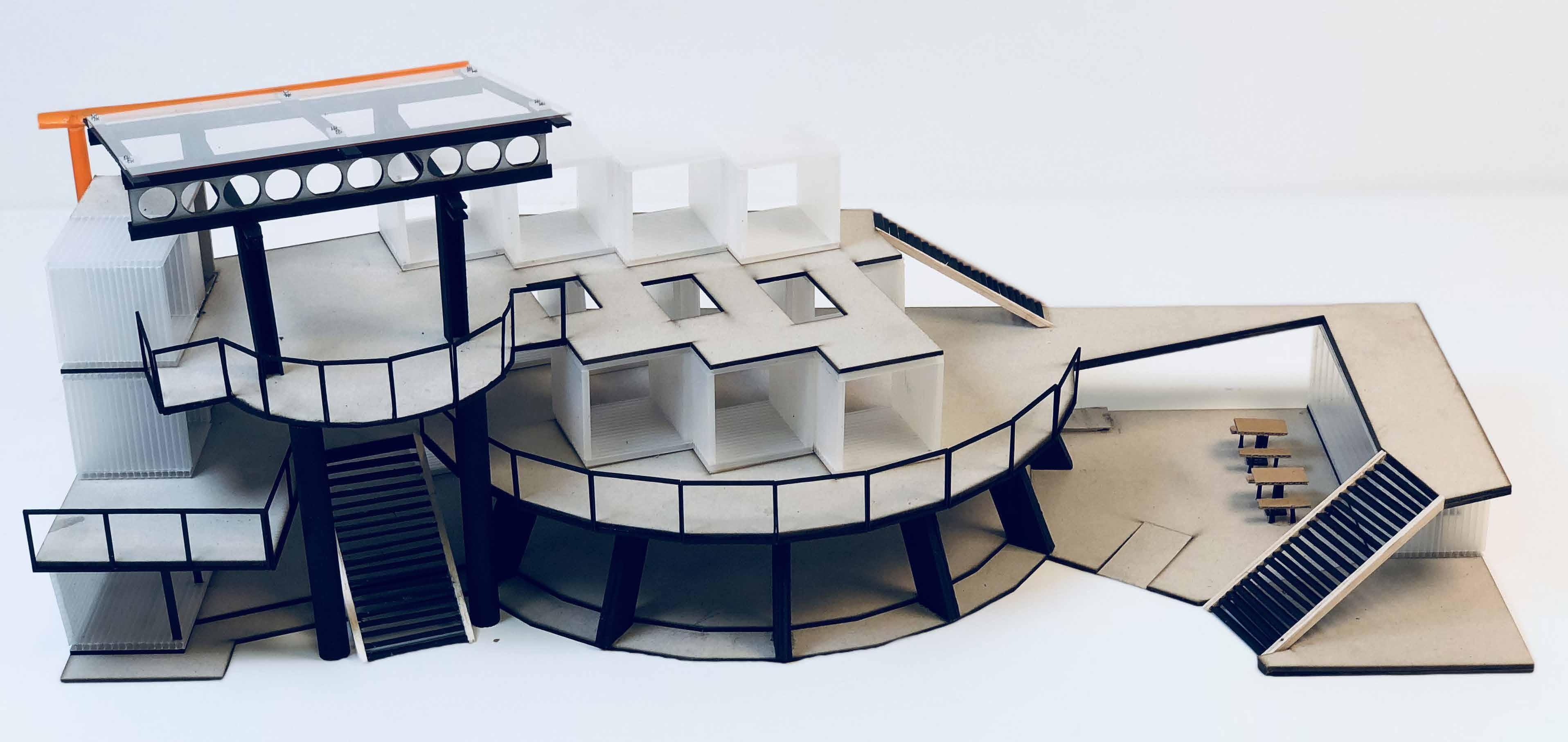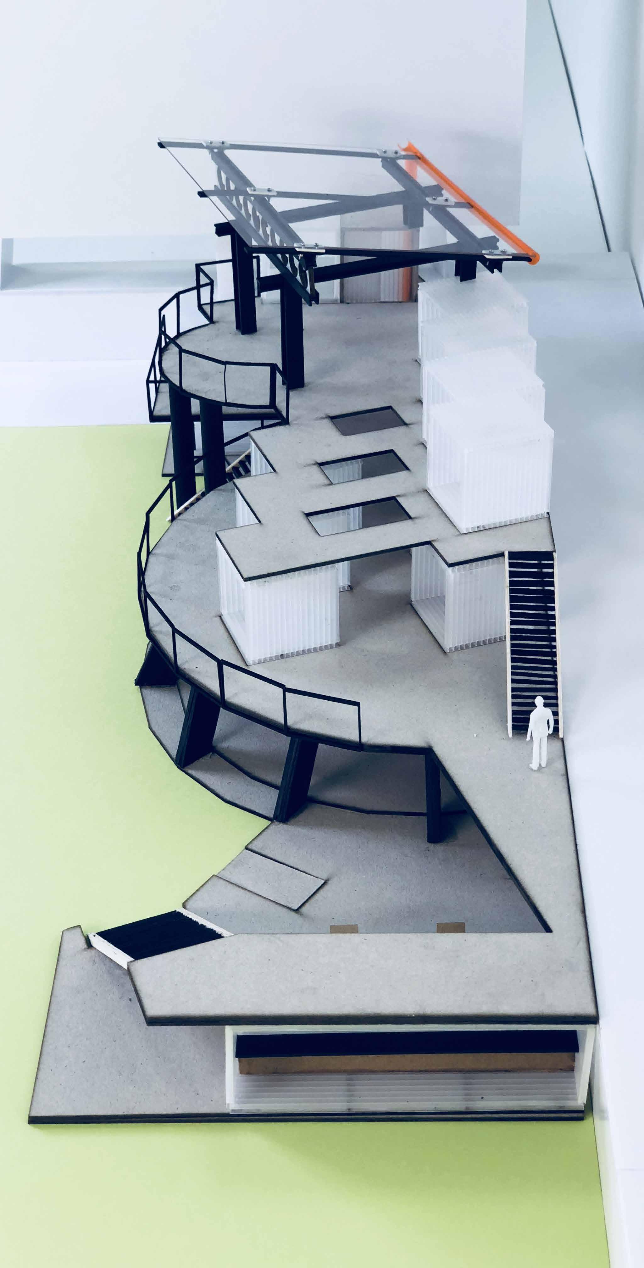 The physical modelling (1:100) began on SketchUp where hand sketches of the building form were developed into 3-D model. Hence on AutoCAD, floor plates and balustrade were laser cut and assembled by hand. The structural elements where detailed with screwwork and spray-painted in black to propose an industrial aesthetics.