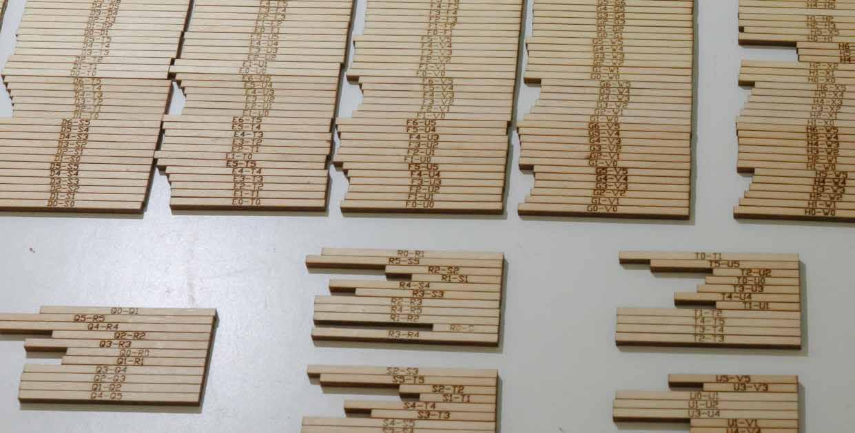On Rhinoceros 3D and Grasshopper a truss model was first modelled. On Grasshopper, the trusses were laid out on a 2-D CAD file and assigned with incremental labels, for example, “A0-B0” horizontally and “A0-A1” vertically. The drawing was laser cut using plywood material.