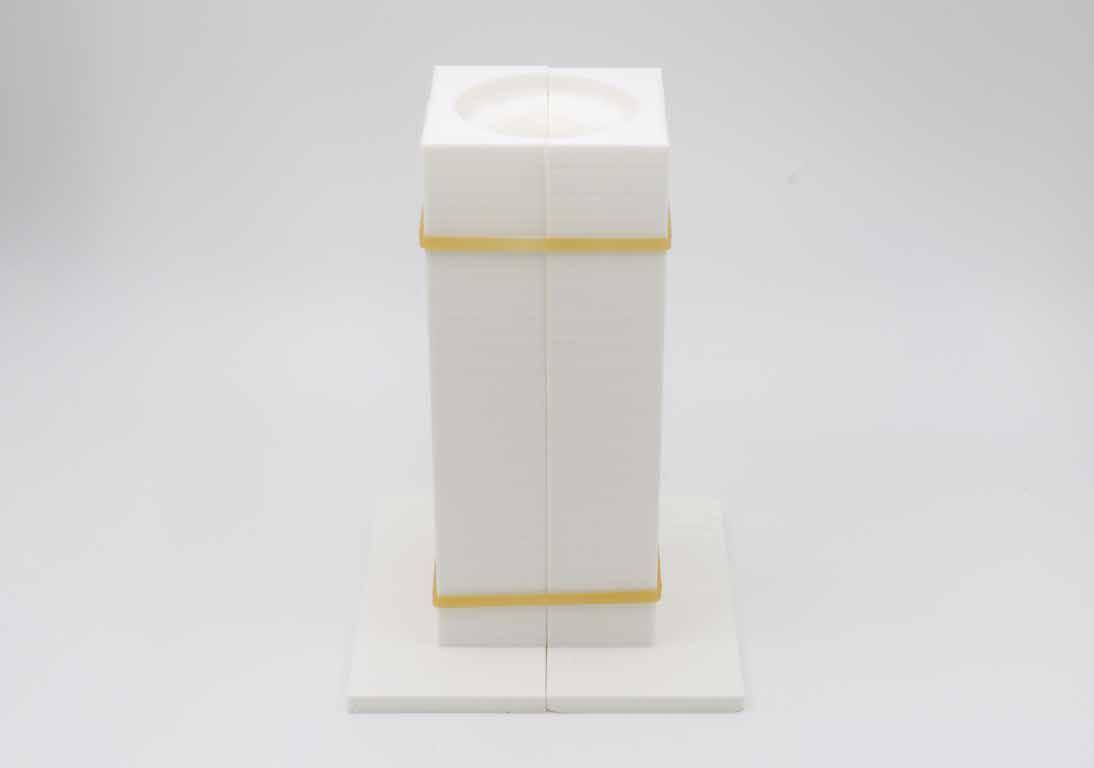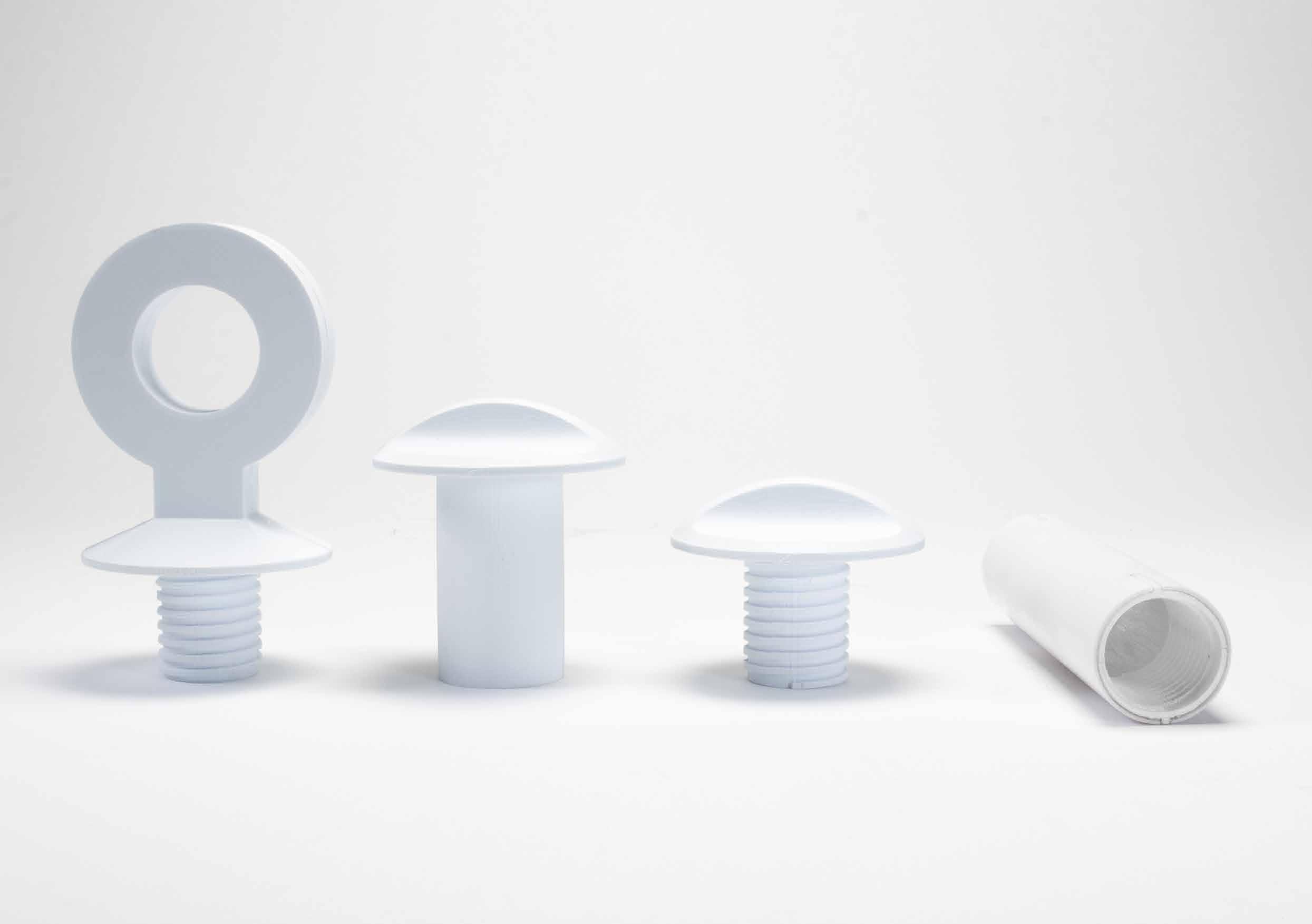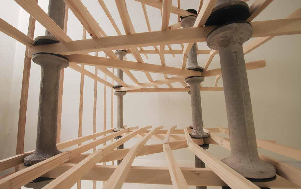 Using workshop machinery including the bandsaw pillar drill and belt sander and disc sander, C24 timber was trimmed, drilled, and polished. A PVC pipe was trimmed and detailed to embed the 3-D printed threads, forming the main ‘axis’ of the structural connection. The 3-D printed components are glued with superglue and G clamps, polished with sandpaper. Petroleum jelly was applied to the threads for smooth screwing.