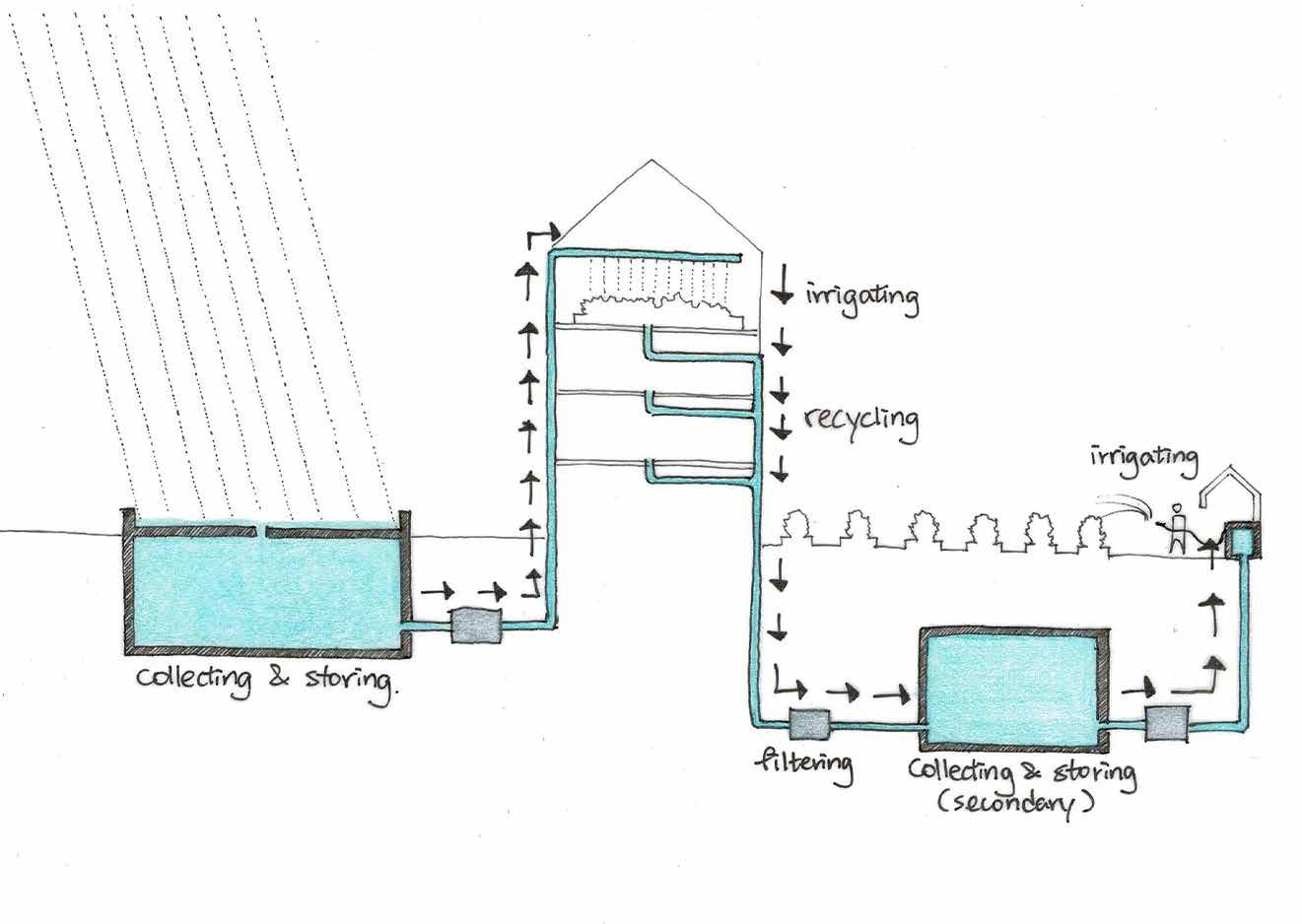 Home to six farmers’ families, the project makes use of Edinburgh’s constant rainfall to supplies agriculture for income generation. Rainwater is harvested and stored in a fountain. It supplies vegetable growing on the rooftop greenhouse and in the farmers’ square. The vegetable crop supplies the six families and is merchandised in a Sunday market around the fountain.
