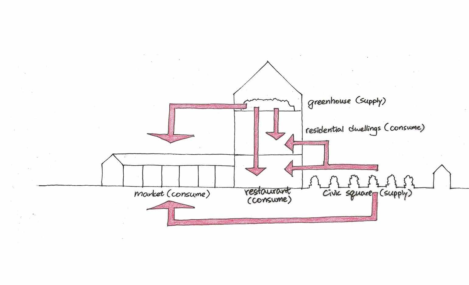 Revolving around a diagonal cut-through, my market hall encourages pedestrains to populate the courtyard and enjoy shopping and alfresco dining experience.