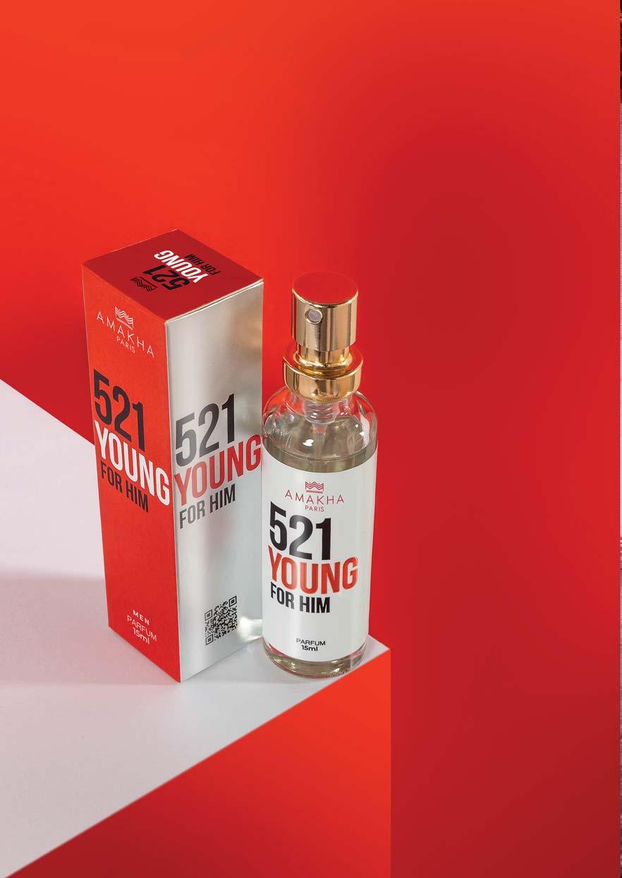 521 YOUNG FOR HER Viva sua personalidade e libere a adrenalina em suas aventuras. A fragrância oferece uma deliciosa combinação de framboesa, flor de laranjeira e sândalo, perfeita para dias urbanos ensolarados, de atividades intensas, repletas de energia e entusiasmo.