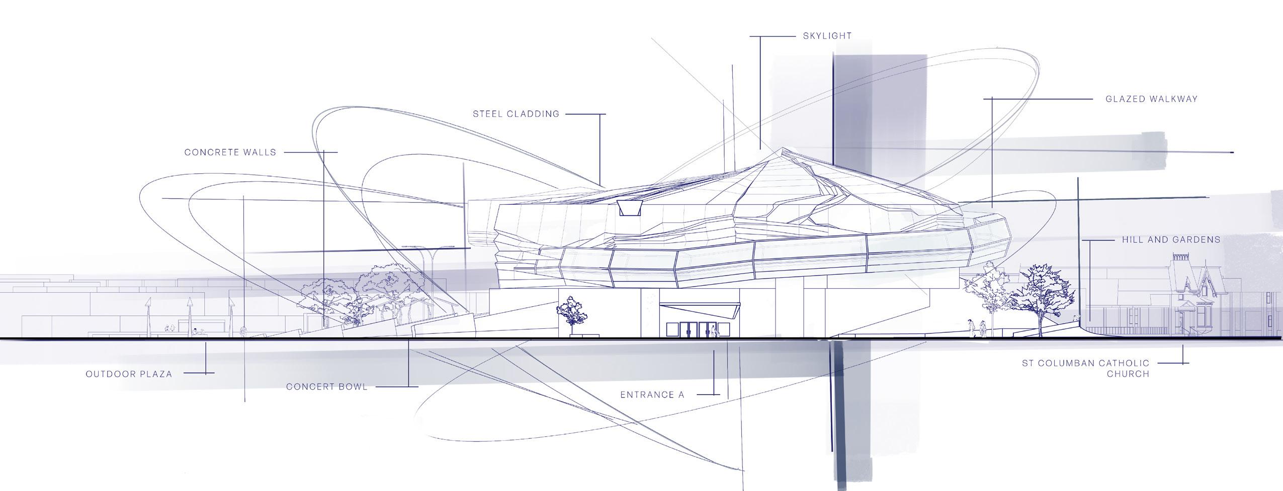 The concert bowl allows a further community engagement, drawing people into the building and into the urban living room, whilst also acting as the more public event space in contrast to the auditorium on the opposing side for more private events such as lectures and presentations.