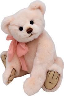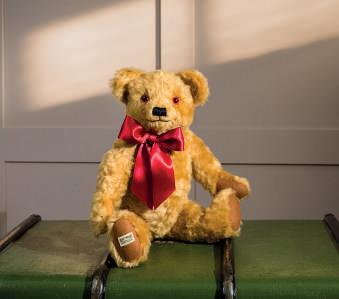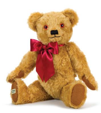 Fully-jointed. Golden mohair plush. Chestnut pure wool felt. Scarlet satin bow. ‘Growls’ when tipped.