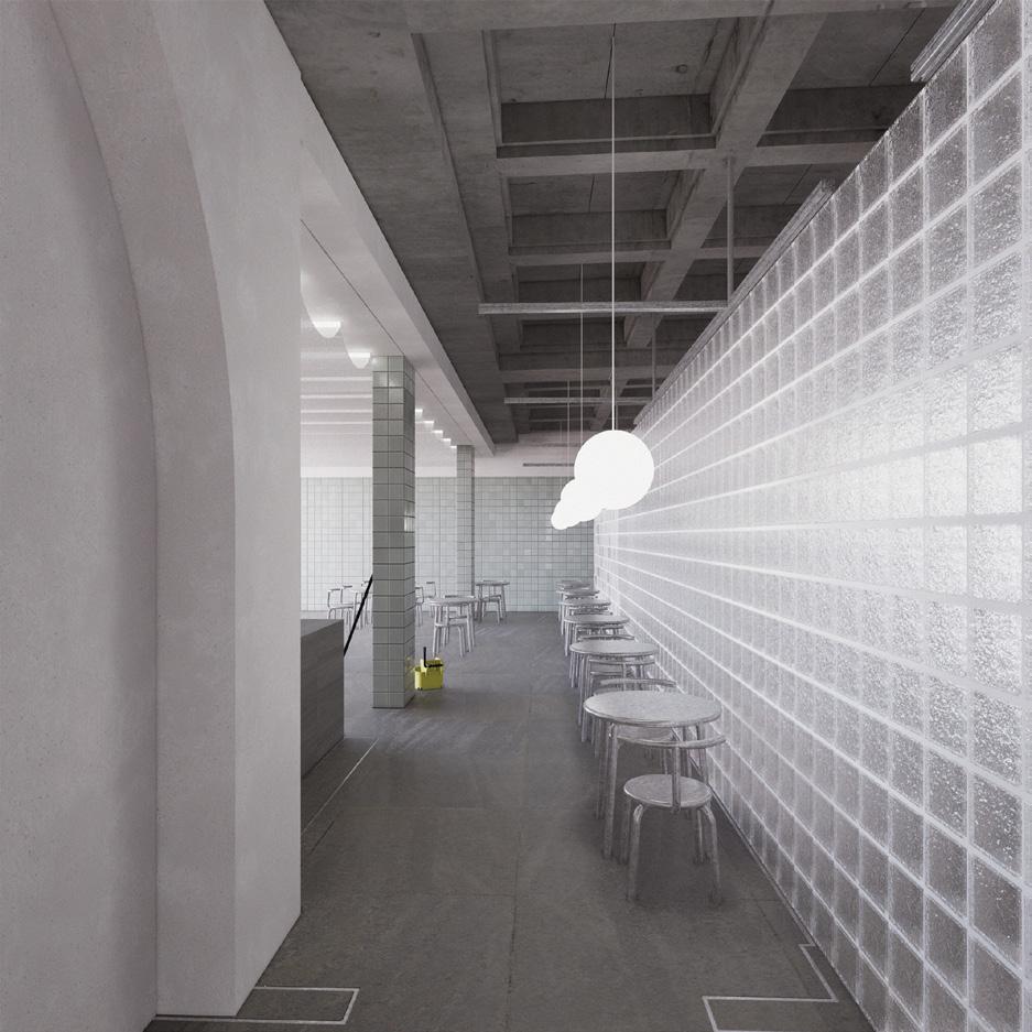 image shows ings. The shop but it has been building also dation. The and the arched visible in the with seating and sit down. facade are visible repeating rhythm Corridor The image ing to Stenahallen, es in the floor Behind the right the locker on these foundation created. Under ing to the left Corridor Gardiner Reception Café Spår Butik Korridor