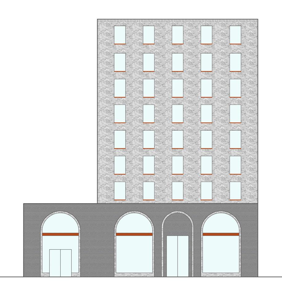 För att göra byggnaden mer spektakulär och ge liv till fasaden är fönstrena inklädda i koppar. När hotellet är nytt kommer kopparn att ha sin gyllene färg, men med tiden kommer patina börja bildas. Byggnadens sockelvåningar är utsmyckade med bågvalv för att ge en klassisk känsla till byggnaden. För att få till ett avslut på byggnaden ställs tegelstenarna på högkant och har en förskjutning utåt. Fönstrena är inskjutna i fasaden för att ge ett skuggspel, samt för att placera fönstrets ovankant gömd bakom tegelmuren.