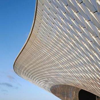 kombination med designen gör att plattorna skiftar färg efter solens strålar. Den nedre delen av byggnaden är klädd i blåglaserat tegel, inspirerat av havet. De tyngre tegelstenarna varvas med stora glaspartier. De vita tegelstenarna smälter väl in i det mer kraftfulla havsblå tegel som utgör podiumbyggnaden. Under vissa delar av dygnet står de i kontrast till varandra, andra gånger smälter de samman till ett.
