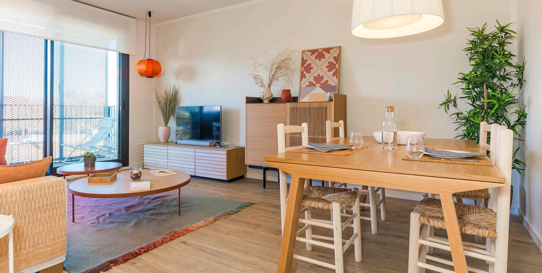 d'estar amb cuina oberta i balcó amb vista al mar.