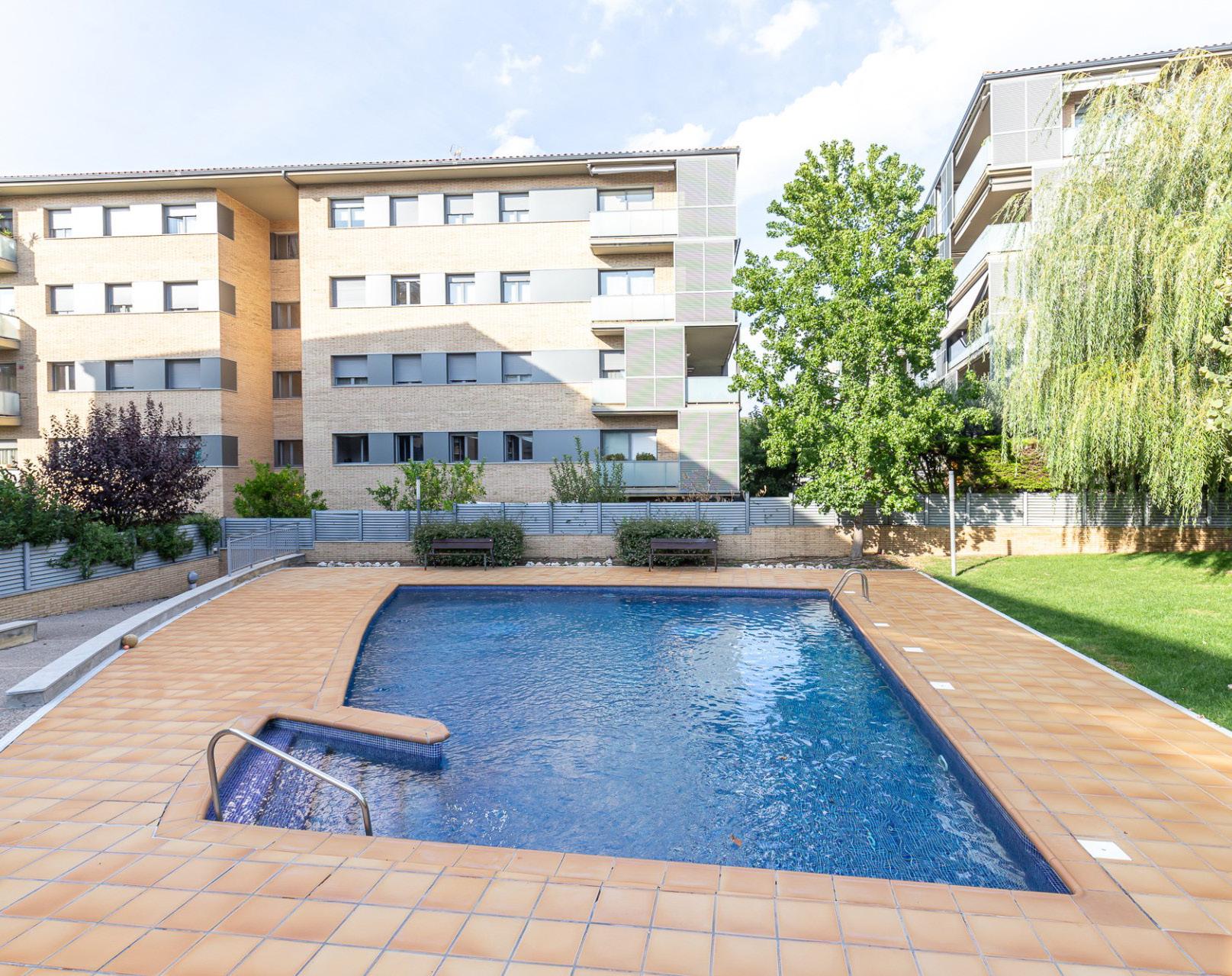 Pis d'obra nova en venda a Girona. Distribuït en rebedor, sala d'estar menjador, cuina, safareig, 3 habitacions (2 dobles i 1 individual), 2 banys i terrassa de 9,18 m². A les zones comunes oferim piscina