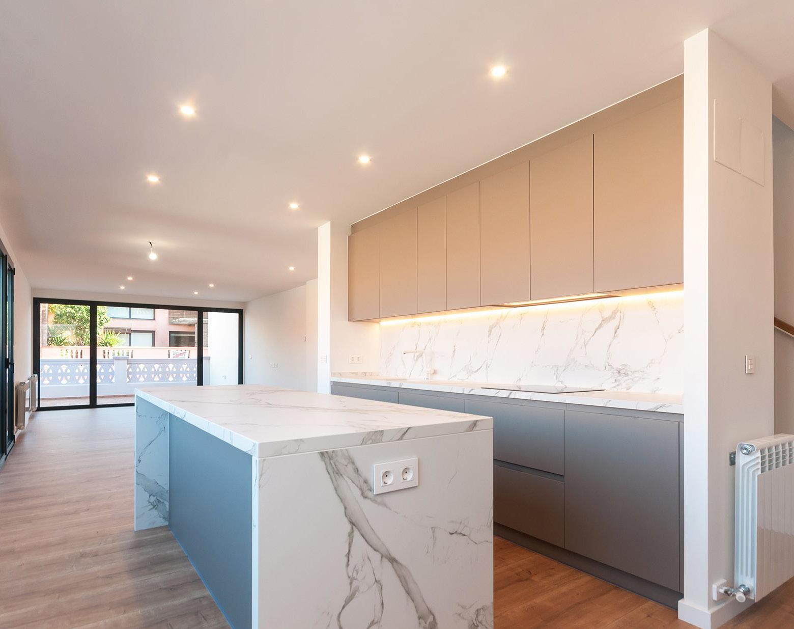 Planta baixa d'obra nova en Projecte de rehabilitació integral Can Barbosa. Compte amb 2 habitacions dobles, sala d'estar-menjador amb cuina integrada, bany complet i una agradable terrassa de 7 m².