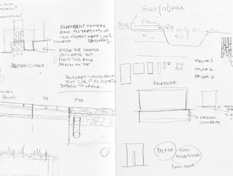 Permeable pavement will be used to consider the drainage condition next to the planting bed. Permeable pavements tend to break and crumble overtime and this characteristic could be used in this project to explore the idea of “design to crack“. The gaps and cracks of the permeable pavements created from the bluestones and recycled materials could gather organic materials and water to allow vegetation to grow.