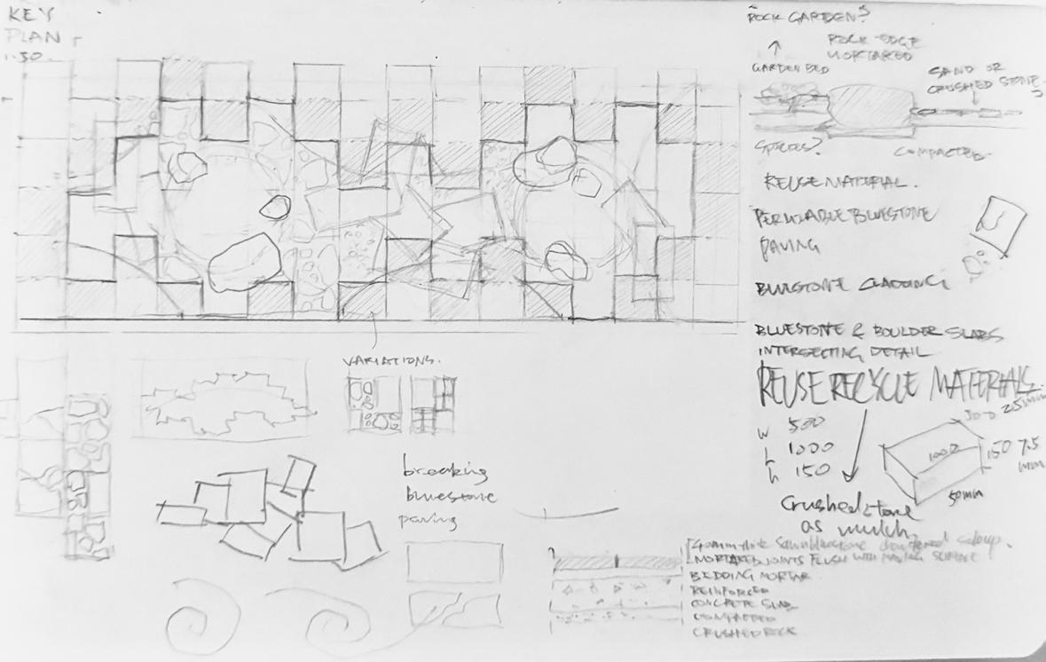Blocks of blue stones will provide an illusion of the bluestone pavings transform into an outcrop of bluestones breaking through the ground. It could also provide a passive seating area for people to interact.
