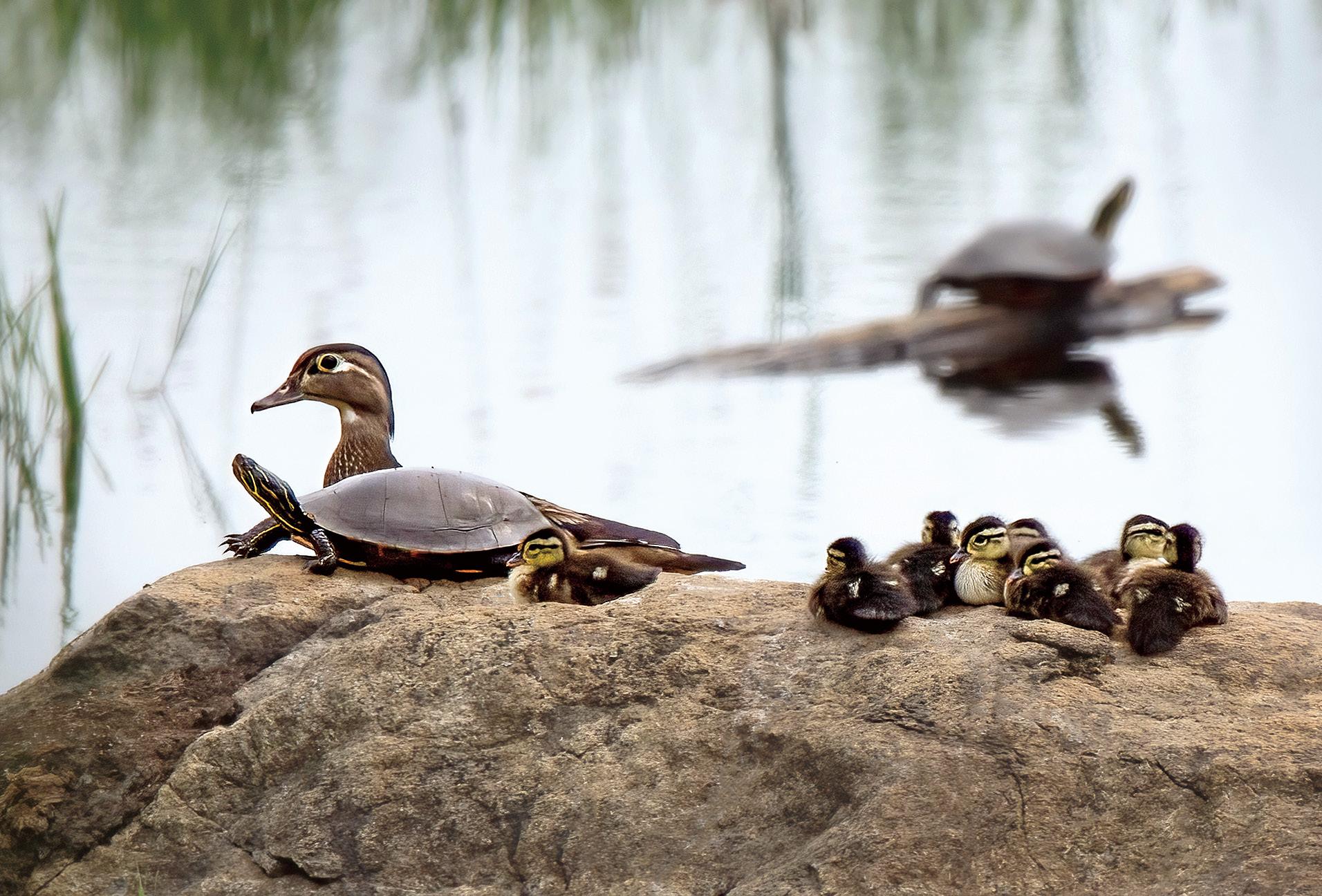 I was canoeing with my son early in the morning last spring. As we rounded a corner, there on a rock was a common merganser mom with 18 babies. I couldn’t get them all in the photo, but what a sight to see with all the little heads pointing in the same direction, waiting for mom to give the signal to swim. Seconds after taking this image, they hit the water and swam faster than we could canoe.—Paul Sundberg