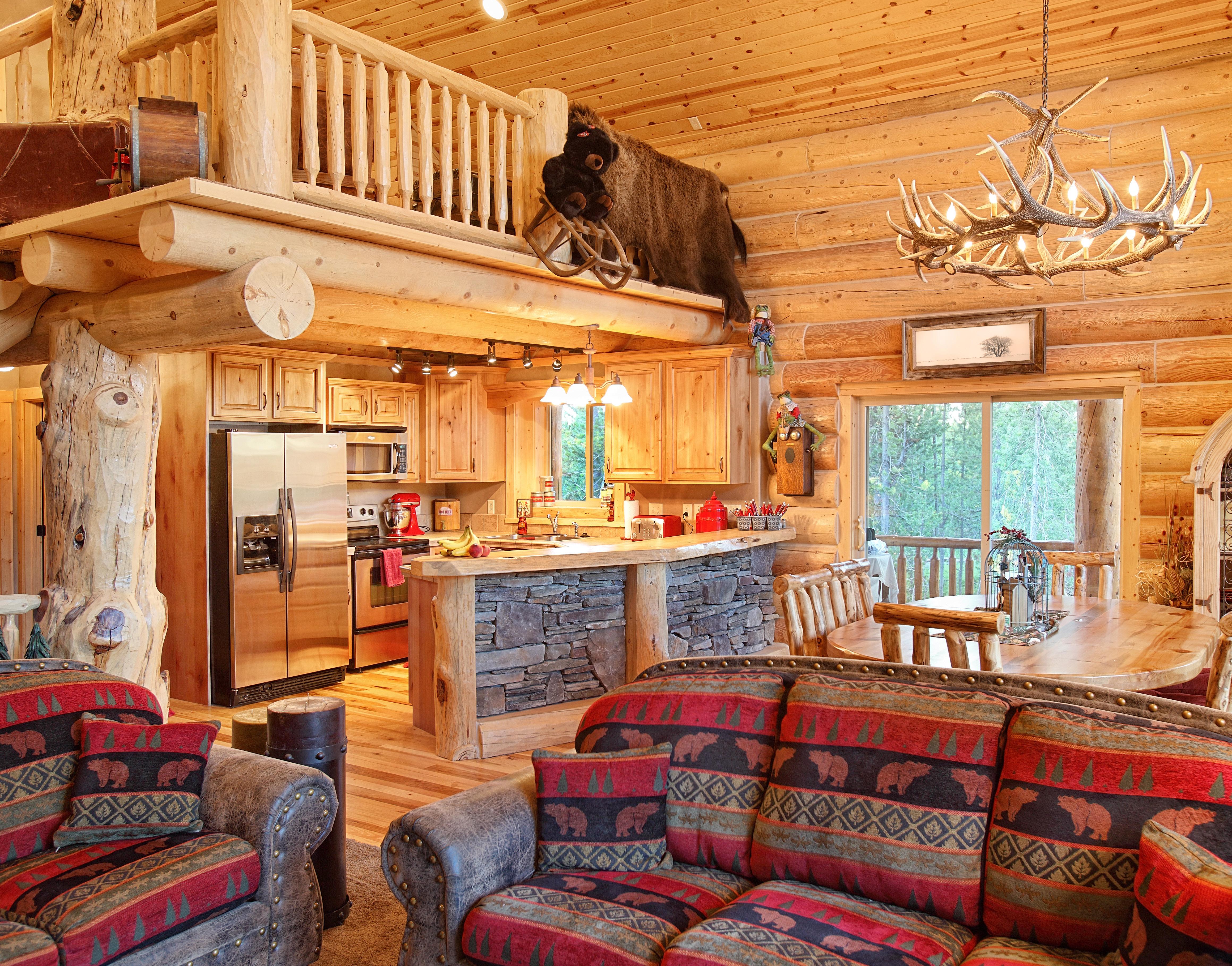 Interior is accented by beautiful diamond willow railings and custom ironwork. Cozy off-grid cabin with propane lights, refrigerator and cooking range reduce utility expenses.