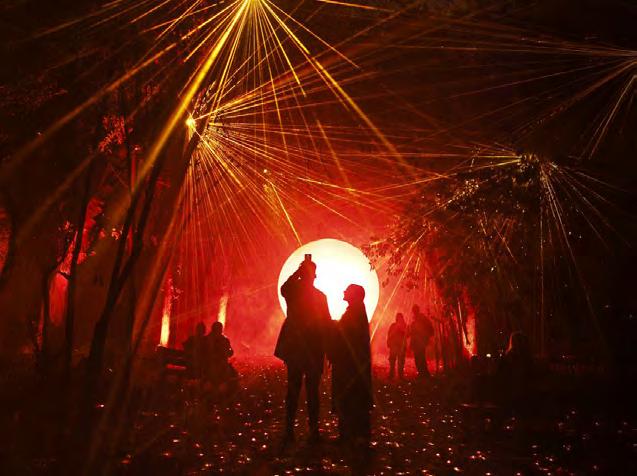 Los visitantes caminan por un pasillo flanqueado por árboles iluminados y torres con luces estroboscópicas que emiten largos filamentos de luz en tonos rojos y naranjas. Al fondo, un difusor de luz gigante crea la ilusión óptica de un sol, ofreciendo una oportunidad fotográfica espectacular.