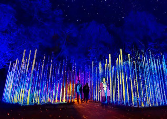 A lo largo de un sendero al aire libre, los asistentes recorren cinco instalaciones monumentales que, mediante juegos de luz, proyecciones y una banda sonora excepcional —a cargo de la banda canadiense The Barr Brothers—, exploran diferentes facetas del mundo natural.
