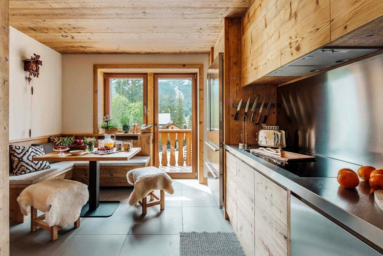 La cucina di villa “Piena di sole”, situata al piano nobile, è un ampio spazio organizzato in modo essenziale e contemporaneo, che si riallaccia al classico montano grazie all’utilizzo dell’abete anticato con verniciatura opaca a tenuta d’acqua.
