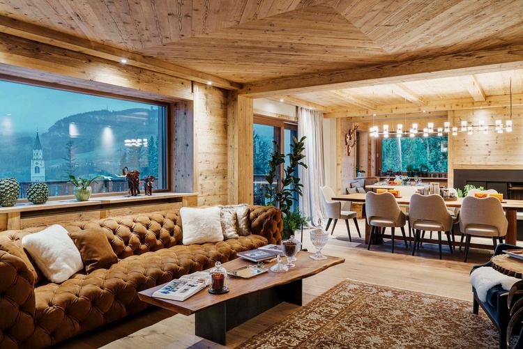 Il primo salotto presenta, invece, travi a vista, per sottolineare gli stretti legami con le usanze e con l'ambiente montano. Il secondo, ha soffitto a losanghe, che suggerisce un'atmosfera più intima. L’architetto Ambra Piccin lo ha concepito come il cuore della casa.