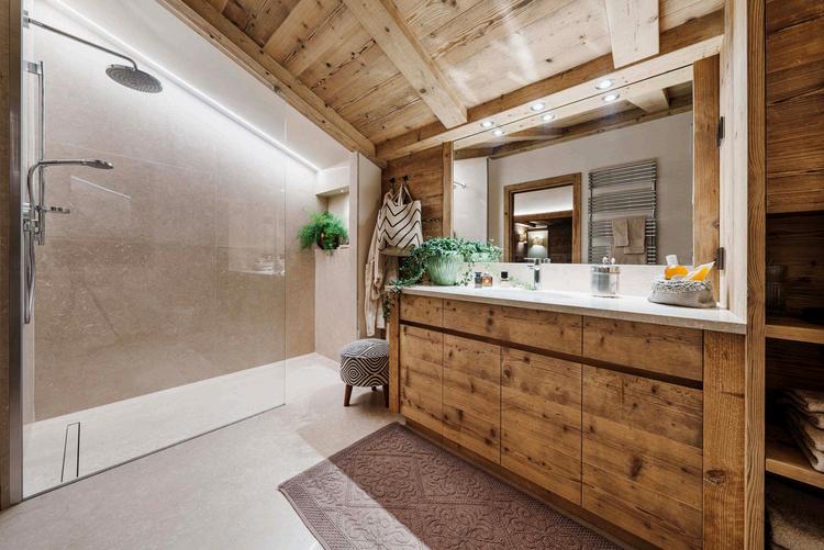 Per i bagni, L’Architetto Piccin ha deciso di affiancare all'abete la pietra Botticino, dal colore chiaro che richiama il manto nevoso. La lavorazione a spacco fa emergere riflessi luminosi accentuati dalla luce dei faretti a raggio stretto, che evidenziano ogni minimo bagliore. L'effetto voluto ricorda una cascata di cristalli di neve, donando un'atmosfera raffinata e signorile. Ho preferito, anche, non ricorrere alla solita cabina doccia in muratura, che tende a oscurare e restringere l'ambiente, sostituendola con lastre di cristallo. Questa scelta permette il passaggio della luce naturale, offrendo la sensazione di spazio ampio e aperto.