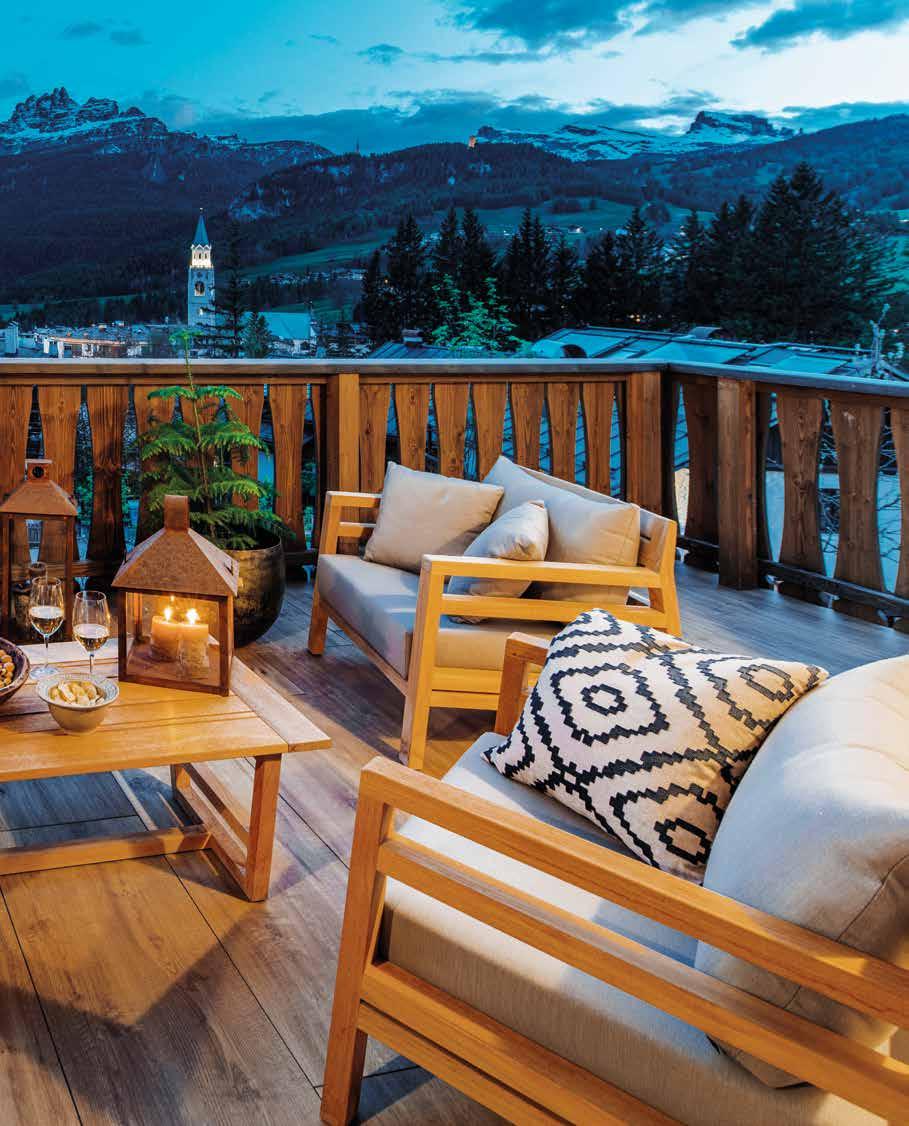 Posta nel cuore di Cortina, vicino al centro ma circondata da prati verdi in proprietà esclusiva, esposta all’irraggiamento solare per tutta la giornata, questa splendida villa completamente ristrutturata e arredata dall’architetto Ambra Piccin è dotata anche di un vasto piano interrato nel quale sono stati dislocati i servizi accessori della casa, dal garage alla ski-room, dalla zona cantina agli ampi depositi. Il piano nobile è situato al piano rialzato-primo, interamente dedicato al living con una successione di soggiorni e zona pranzo che va da parte a parte per tutta la sua lunghezza, oltre alla cucina e all’ampio ingresso con annesso guardaroba e servizio per gli ospiti. Al piano terra alcune camere da letto un grande soggiorno e la zona wellness ricercata e raffnata nella quale è stato ricavato anche un grande camino. Sopra il piano nobile, al piano secondo e terzo, altre camere e relativi soggiorni sono stati concepiti per garantire il massimo confort ai membri della famiglia di imprenditori, da sempre appassionati di Cortina. L’impostazione voluta dall’architetto è una miscela di look essenziali, una contaminazione tra lo stile classico delle dimore alpine, con un ampio uso di legni e ferro battuto e quello moderno che rispecchia le esigenze di oggi. Il risultato è un’atmosfera accogliente e familiare, seppure i dettagli parlino tutti il linguaggio dell’esclusività. Il progetto distributivo degli spazi interni si sviluppa su quattro livelli collegati tra loro da una scala in acciaio satinato e legno progettata e realizzata da un fabbro artigiano locale: è questo l’elemento dominante che guida l’intero assetto distributivo interno. In questa casa il protagonista il legno affancato dalla pietra otticino con lavorazione a spacco che conferisce una speciale luminosità, accentuata i con faretti a raggio molto stretto. effetto fnale una pioggia di cristalli di neve. Negli ambienti dedicati ai salotti sono state realizzate due stufe in maiolica progettate dall’architetto Piccin, e una terza, rotonda e