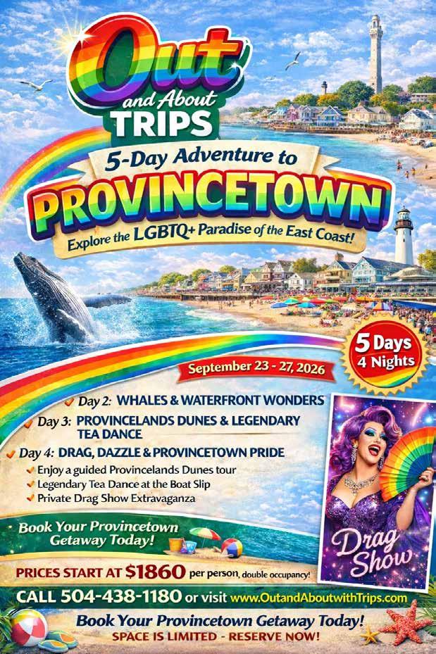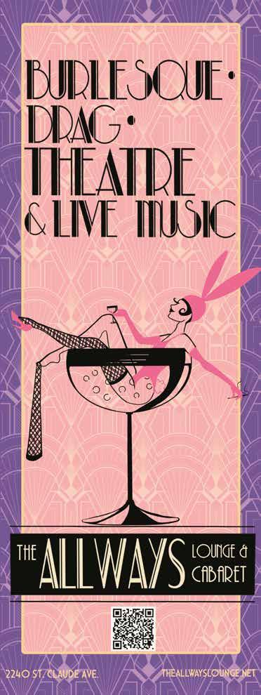 Fab Fridays Show Night: Splash Nightclub; 2183 Highland Rd., Baton Rouge; 9 p.m. Join us every Friday for the hottest drag show in the capital city! Get ready to be dazzled by the fabulous Bombshells of Baton Rouge, plus a sur prise special guest each week! Hosted by the fabulous Miss Thing, who ’s serving looks and laughs all night long! Whether you ’re a drag aficionado or just looking for a fun night out, this is the place to be! Don’t miss the chance to live your best life with us! $4 well drinks before 11:00 p.m.