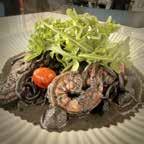 That sweetness comes from the black garlic, which is aged for weeks. There are several cloves tossed with the squid ink pasta, which is also black. Like the sauce, it ’s milder than you might assume, and slightly nutty due to the wheat. Perfectly cooked shrimp are mixed into the sauce; the black hue they