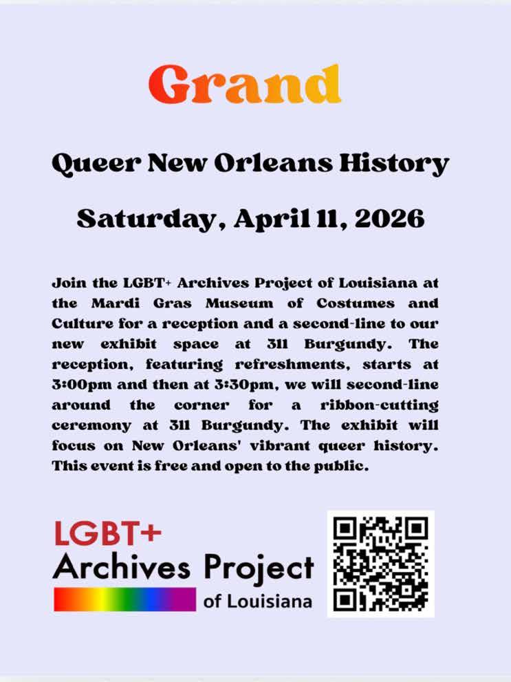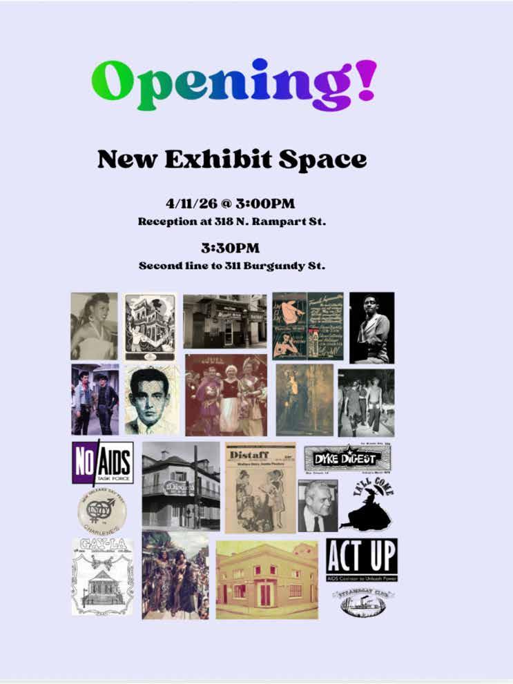 I am also happy to report that in recent months I have spearheaded an effort on behalf of the LGBT+ Archives Project of Louis iana to open a Queer History Exhibit Space in the French Quarter. The exhibit will feature a timeline of local queer history a s well as informational panels and photographs that document that history. The space, located at 311 Burgundy Street in the French Quarter, is slated to open on Saturday, April 11, with a Grand Opening / Ribbon Cutting Ceremony. The exhibit will be open seven days a week from 10:00 a.m. to 5:00 p.m. and will be free and open to the public. The space will also house an administrati ve office and serve as a digitization center. The organization currently has a backlog of materials that need to be scanned and uploaded to its website.