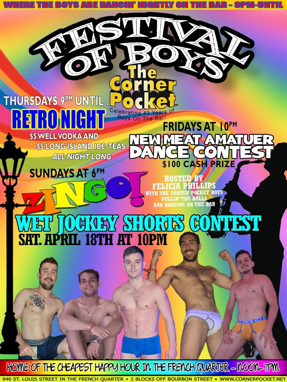 The Famous Corner Pocket New Meat Contest; The Corner Pocket; 940 St. Louis St.; 10 p.m. (Boys dancin ’ from 7 p.m.). The country ’s longest running all male amateur dance contest (over three decades!) Hosted by Corner Pocket Emcee Felicia Phillips and former Southern Decadence Grand Marshal. Bring your sexiest, skimpiest, and tightest undies (but no jock straps) for a chance at a cash prize of $100 ($200 if it ’s your